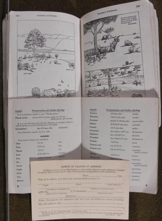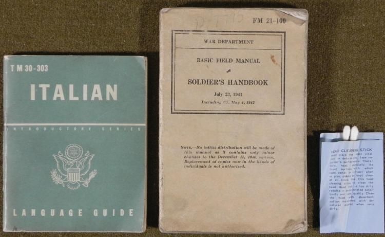 OFFERED HERE IS A WWII G I FIELD MANUAL WITH ITALIAN LANGUAGE GUIDE & HEAD CLEANING STICKS (GI FOR Q-TIPS). THE HEAD CLEANING STICKS PAPER EXPLANATION WAS PRINTED IN JAPAN. * *