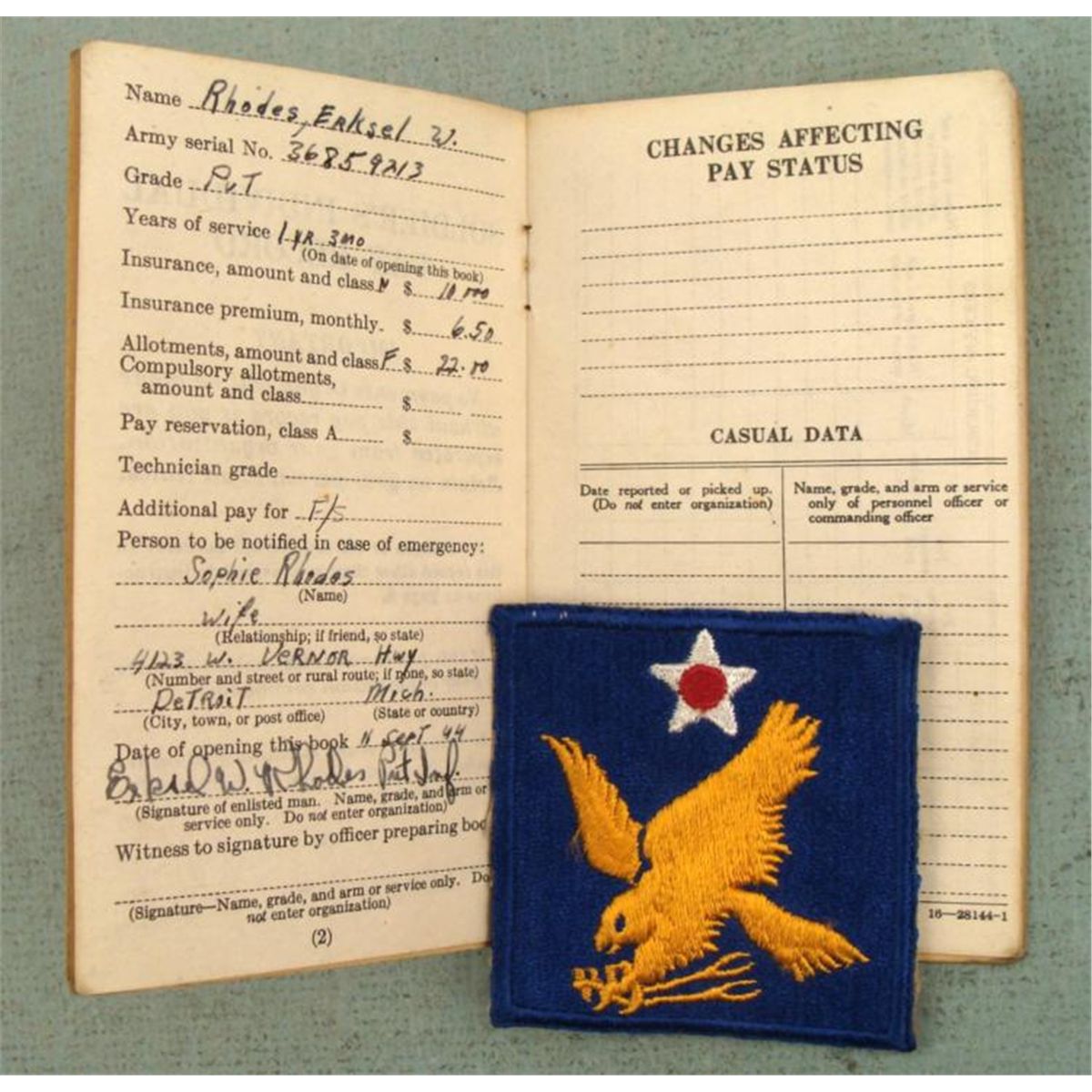 HERE IS A NICE WWII G I LOT. YOU WILL RECEIVE A 2ND AIR FORCE PATCH, A OFFICERS CAP INSIGNIA, A PHOTO, AND A SOLDIERS INDIVIDUAL PAY RECORD. * * *