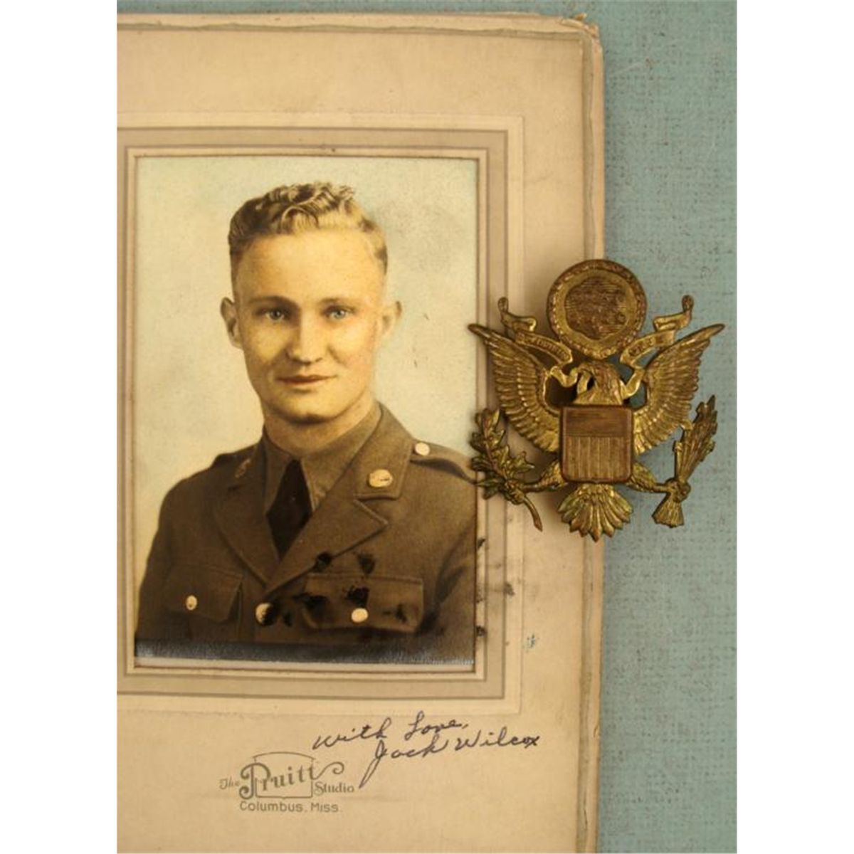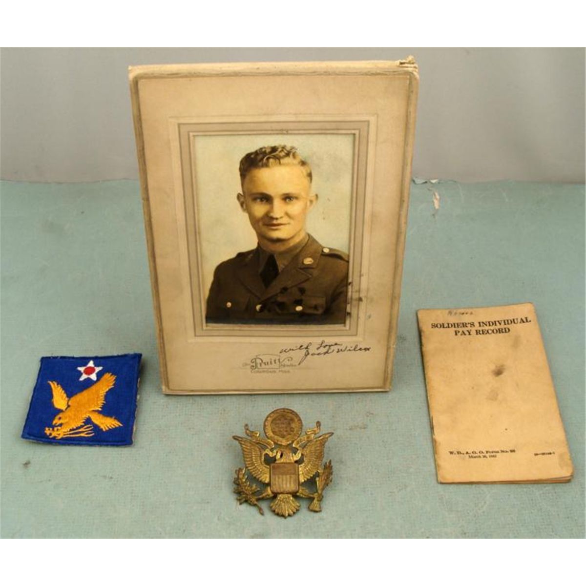 HERE IS A NICE WWII G I LOT. YOU WILL RECEIVE A 2ND AIR FORCE PATCH, A OFFICERS CAP INSIGNIA, A PHOTO, AND A SOLDIERS INDIVIDUAL PAY RECORD. * * *