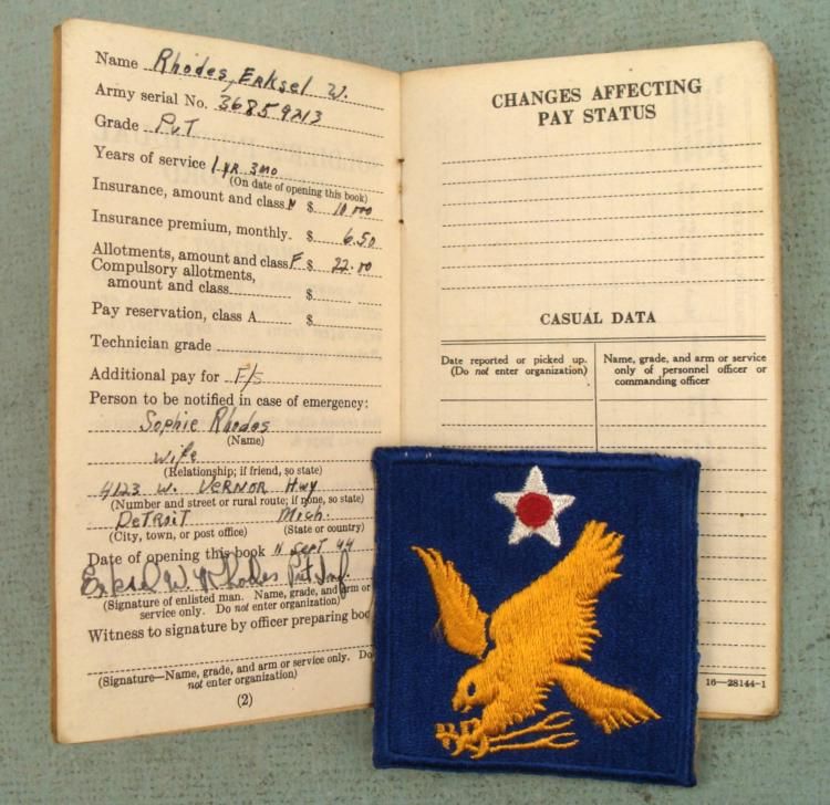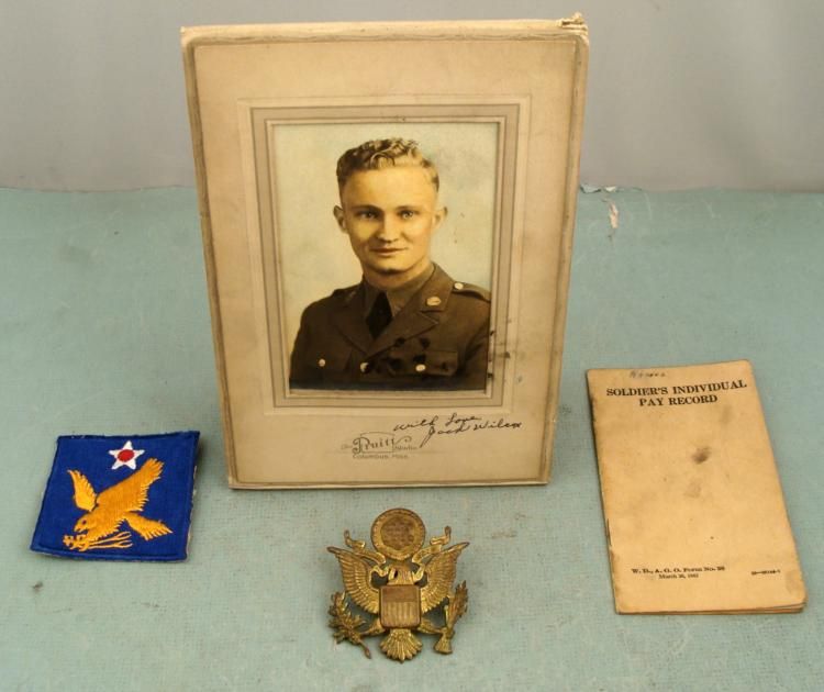 HERE IS A NICE WWII G I LOT. YOU WILL RECEIVE A 2ND AIR FORCE PATCH, A OFFICERS CAP INSIGNIA, A PHOTO, AND A SOLDIERS INDIVIDUAL PAY RECORD. * * *