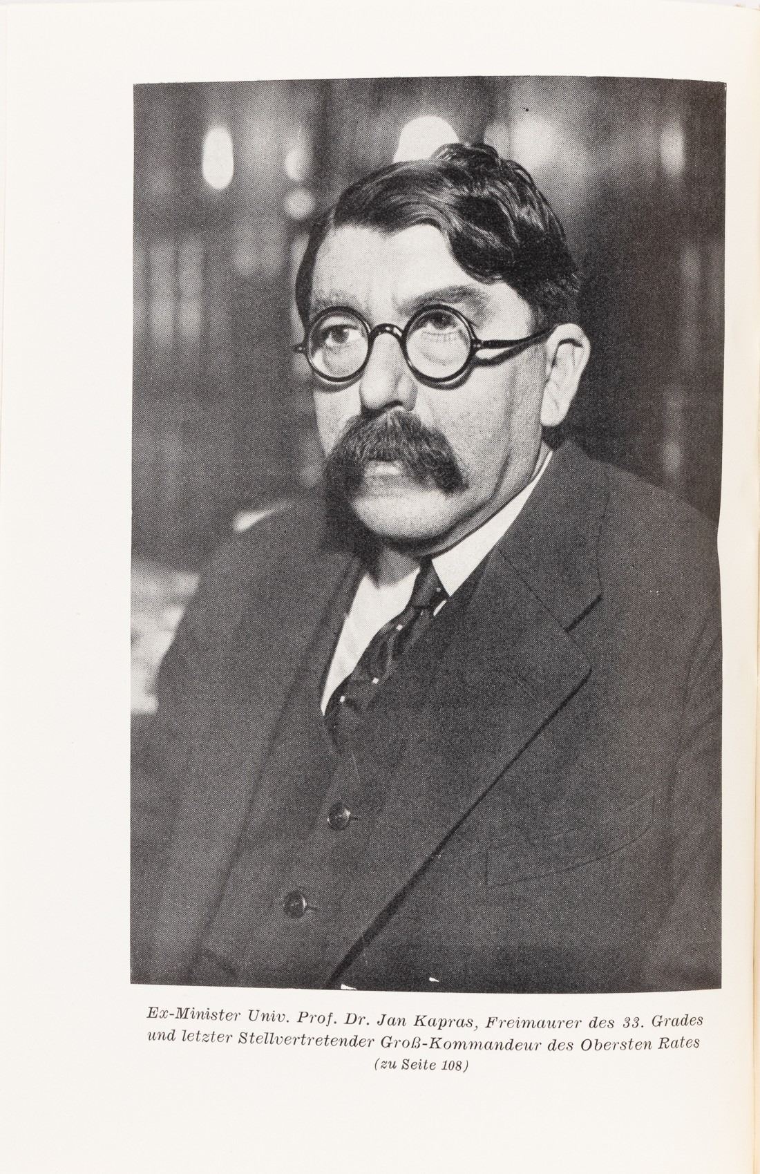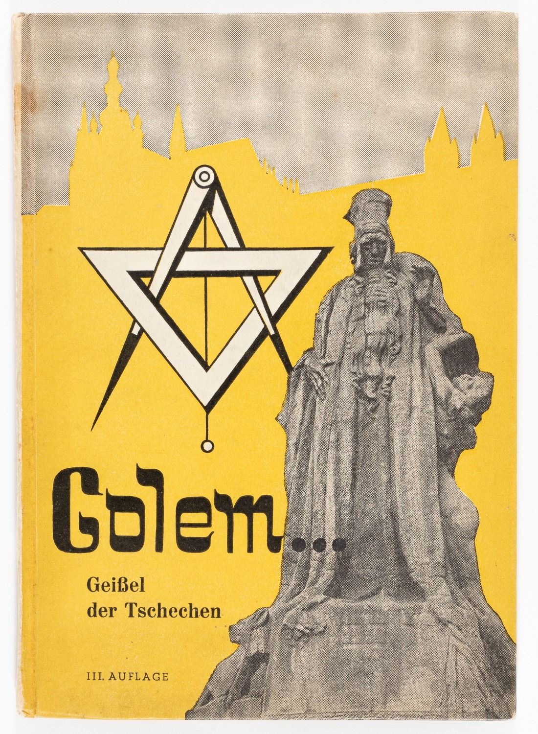 German WWII diatribe 'Golem - Scourge of the Czechs - The Destruction of Czech Nationalism', written by SS-Obersturmbannfuhrer Walter Jacobi, head of SD-Leitabschnitt in Prague, Orbis-Verlag, Prague, 1942, 132 pages, hardcover, 8.5 x 5.5 in., illustrated. This book was intended to reveal to the Czechs the manner in which they were sacrificed to a Jewish Free Masonic conspiracy under the pretext of achieving national independence. All the Czech newspapers, controlled by the Nazis, were obliged to print a review of this book, eulogizing it as a literary masterpiece.