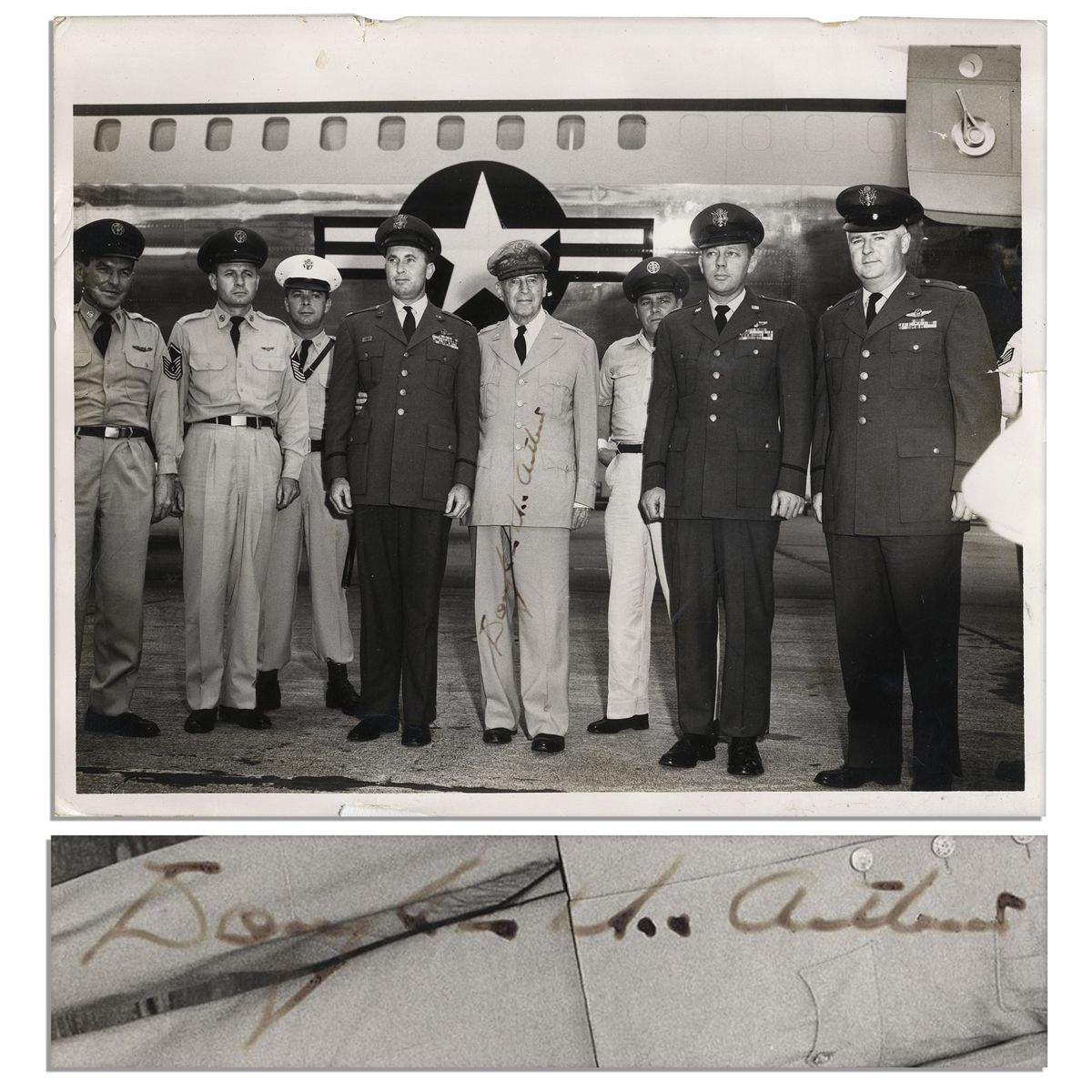 General Douglas MacArthur signed photograph. Black and white photo pictures the stoic-looking General dressed in uniform alongside various Air Force generals. Black ink signature signed vertically across his photo: ''Douglas MacArthur''. Glossy photo measures 10'' x 8'' with a small chip to lower edge and some creasing throughout. Very good.