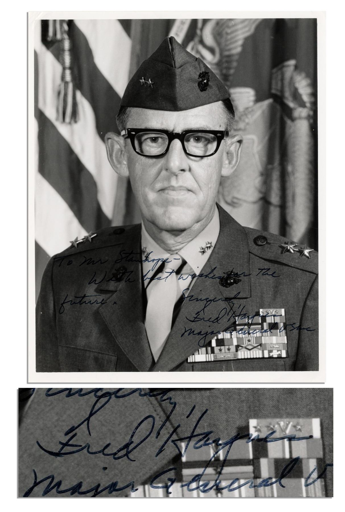 WWII Marine General Fred Haynes Signed 8'' x 10'' Glossy Photo -- of Iwo Jima Fame -- ''...Sincerely Fred Hayes / Major General US core'' -- Near Fine