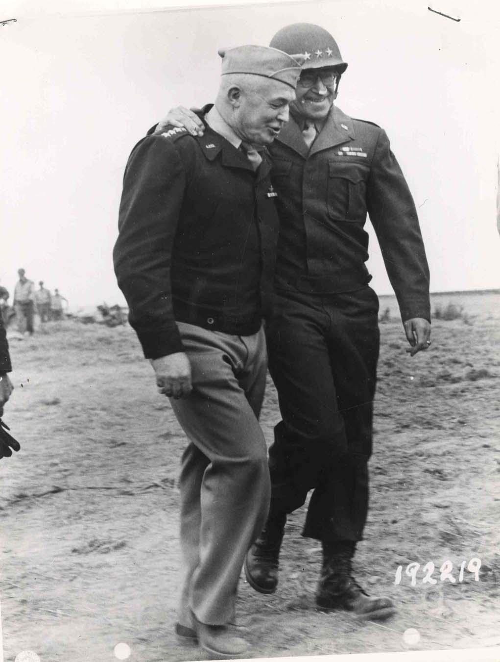 Original wire photo of Generals Henry ''Hap'' Arnold and Omar Bradley talking amiably as they walk on a French beach-head. Information sheet from the Army Photographic Agency stapled to photo which dates photo to 12 June 1944. Sheet also stamped, ''Released for Publication by Overseas Field Press Censor.'' 8'' x 10'' black and white glossy photo has two staples at top, otherwise very good condition.