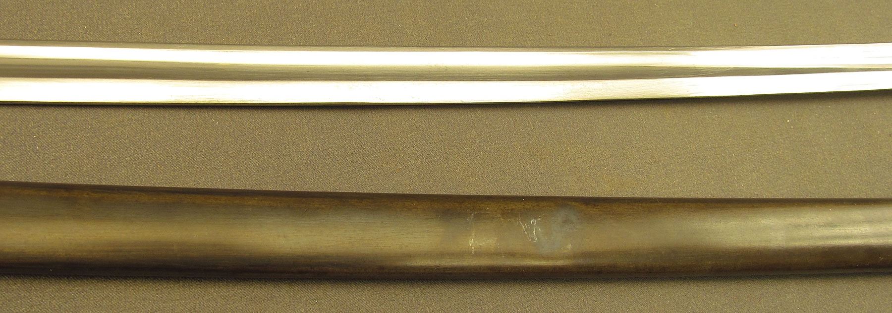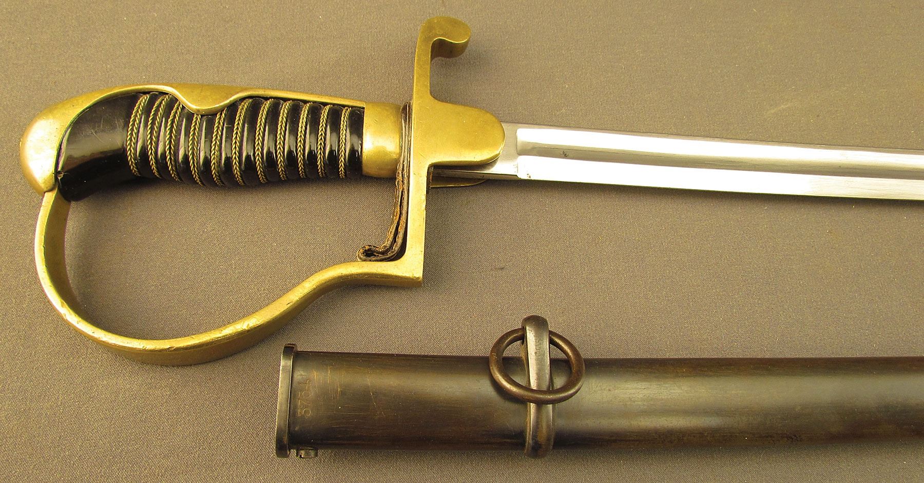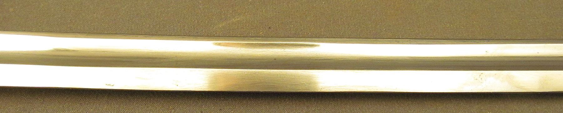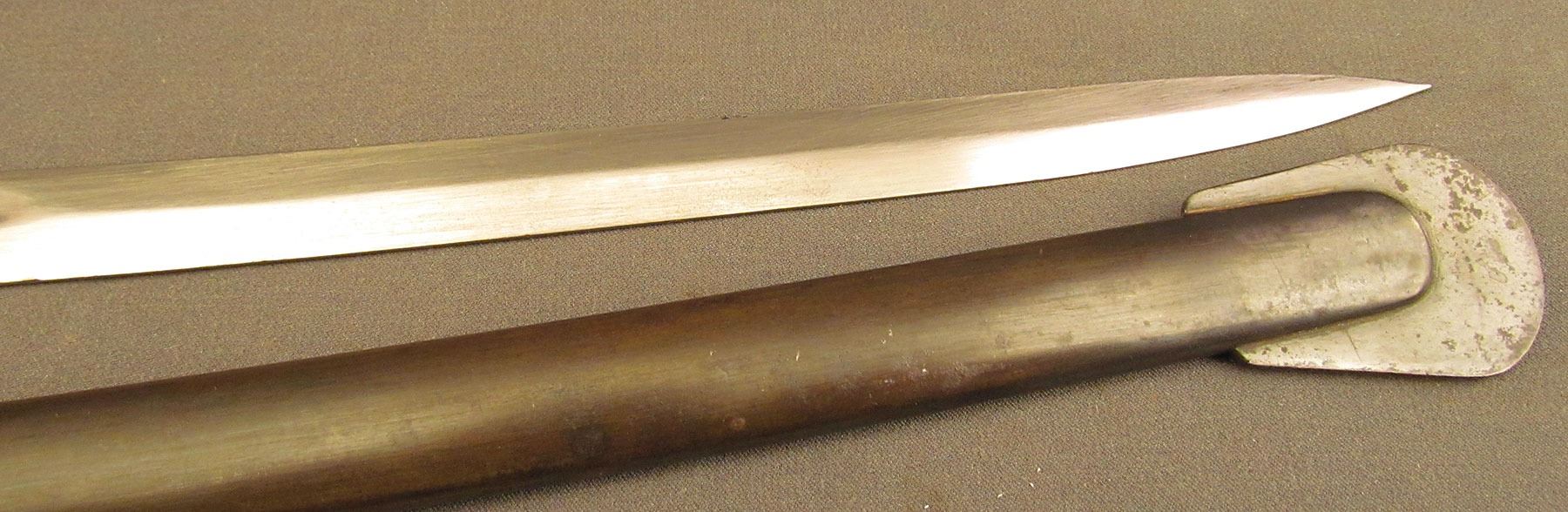 WWII-era German Army Ordnance Sword by ALCOSO, measuring 39 3/8? overall with a 34? slightly curved, single-edged blade with long single fullers. The blade has an excellent, nearly spotless original polish, but does exhibit a few very minor specks of dark freckling on the forte obverse. A deeply struck ALCOSO “Scales” trademark is present on the ricasso reverse, as is a small Waffenamt proof on the back edge just above the hilt. The hilt itself is of standard pattern with single quillon, unmarked tombstone langets, stirrup guard, and dove pommel. The brass has a mild, yellow-ochre patina throughout with some very minor impact marks near the capstan nut, and the numerous Waffenamt proofs and issue stamps are all crisp and clear. The leather ‘fingerschlauf’ (finger loop) is crazed and lightly flaked, but still intact and quite supple. The black composite grip is in excellent condition with a tight, original wire wrap. The matching numbered scabbard has a smooth, blue-brown patina with a few shallow dents along the body on either side. This is a great example of a Heer-issued sword and would make a splendid addition to any collection.
