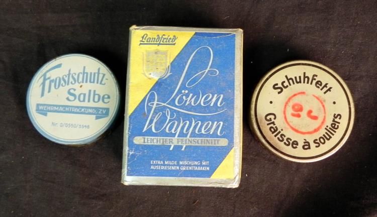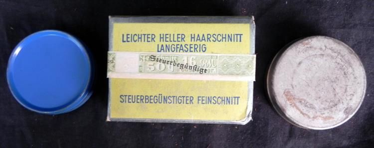 Offered are these WWII German Cigarettes and Tobacco Cans. The cigarettes are unopened and both tobacco cans measure about 2.5 inches in diameter.