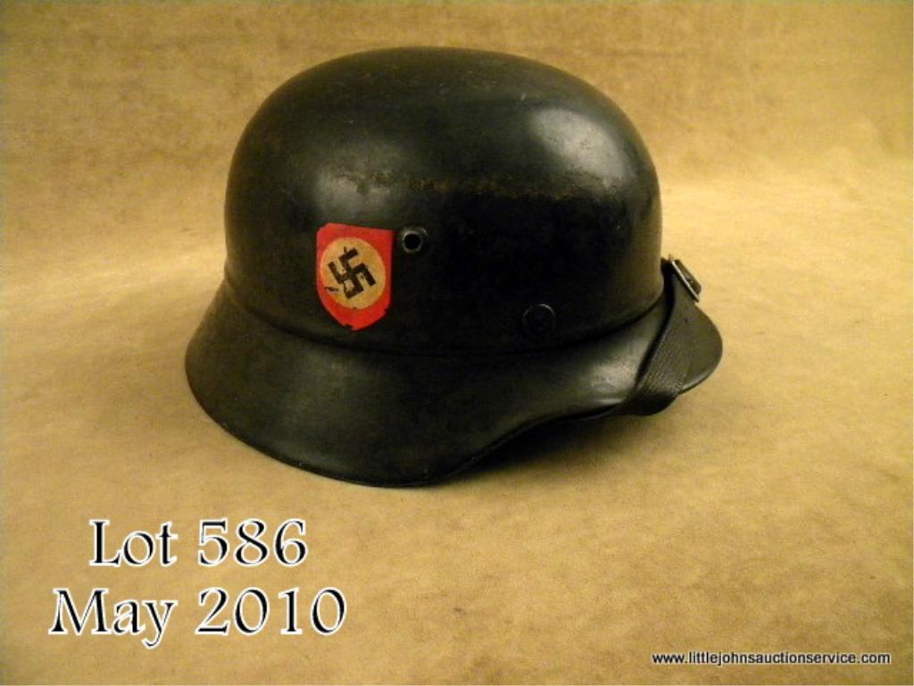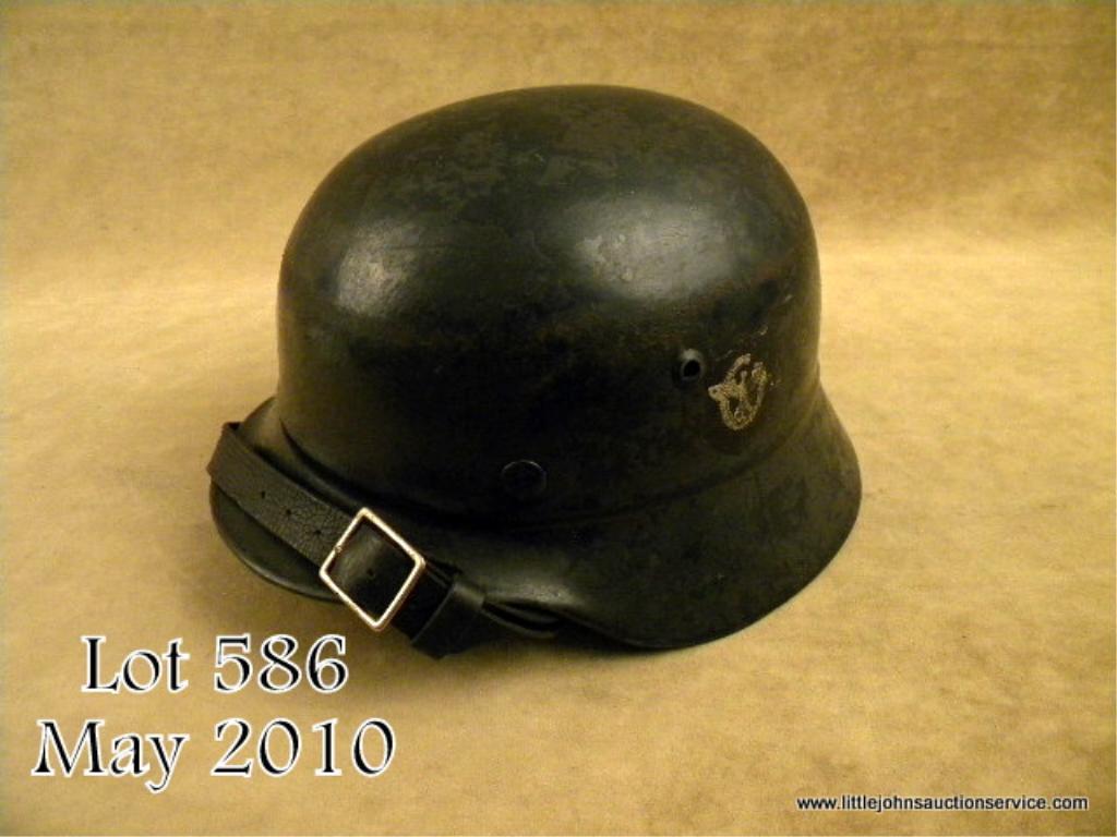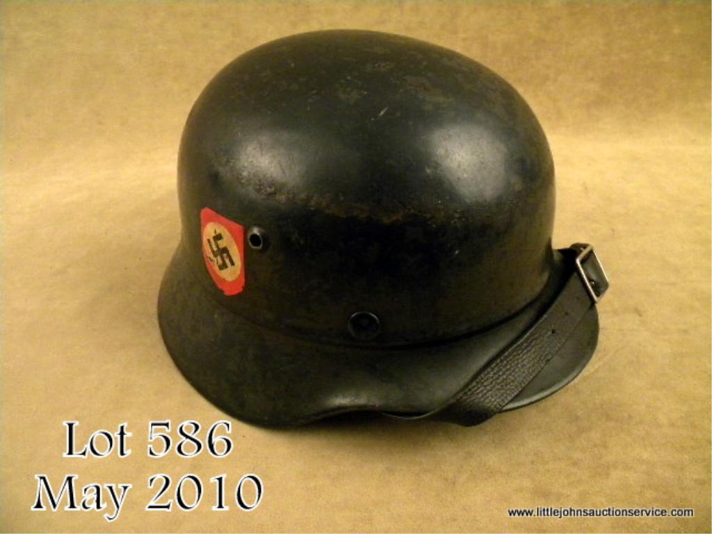 WWII German Civil Police Helmet. Retains approx. 85% of its original painted black finish and is complete with both police and national decals, liner and chinstrap. Very good condition. Est. $200-400