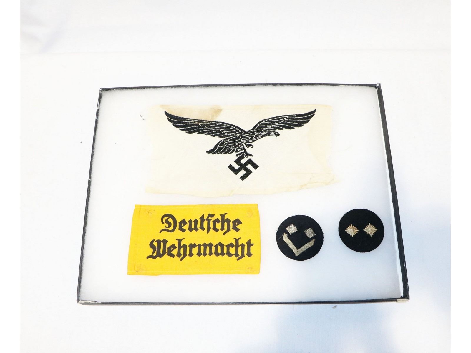 Including: Luftwaffe Sport Shirt patch, German Army armband, 2 rank insignias. Also includes a German Army belt buckle. Display case is not included. See photos.