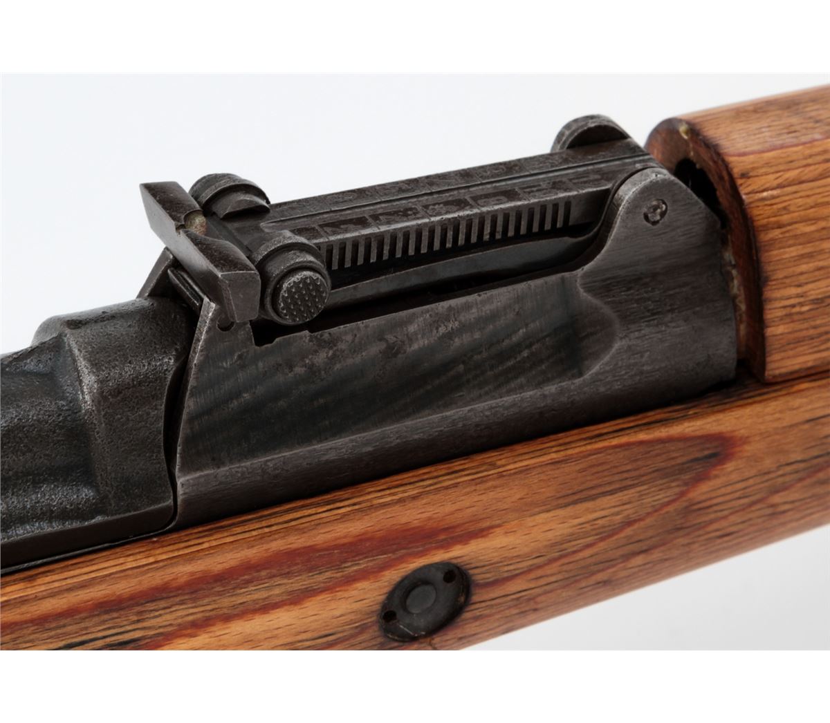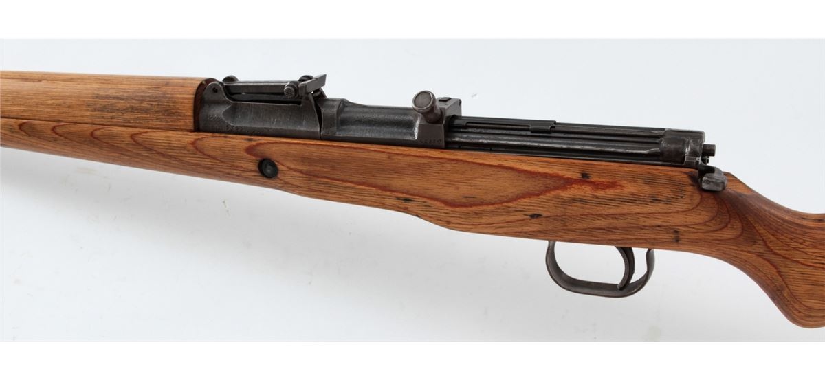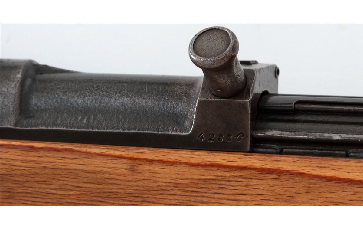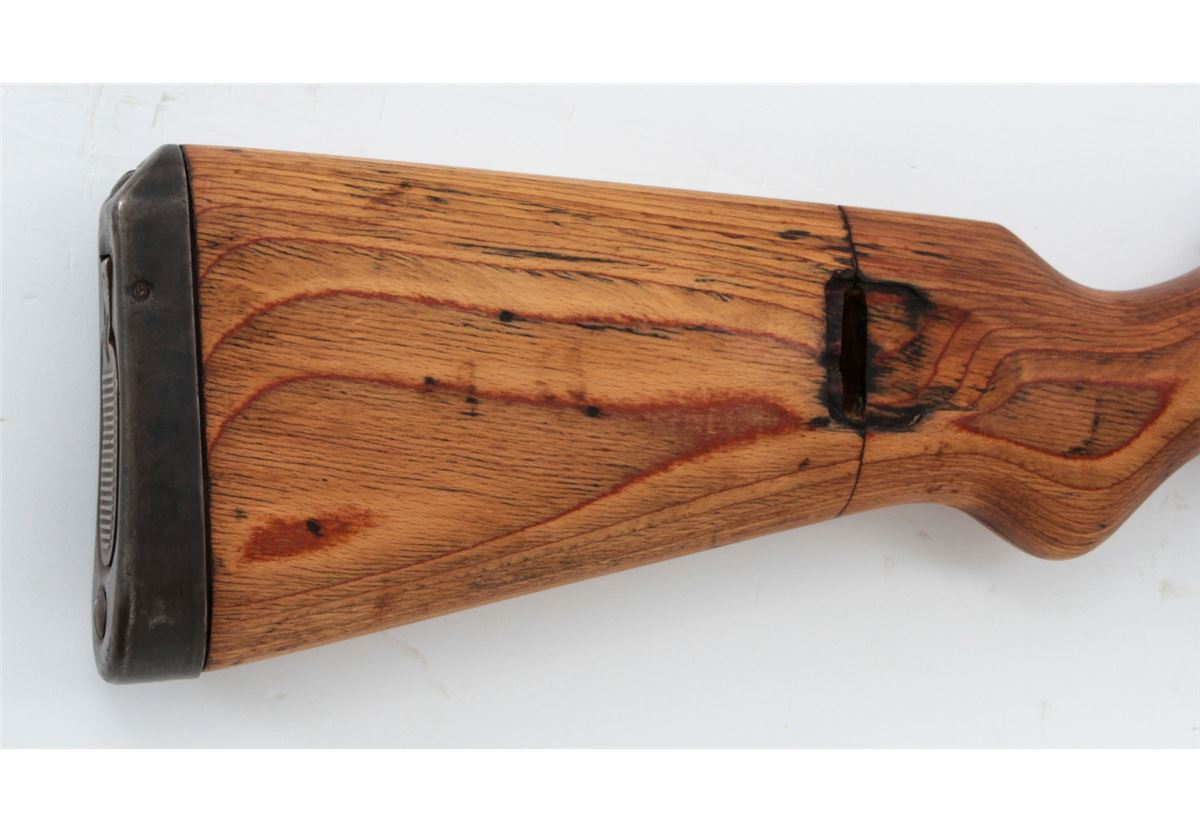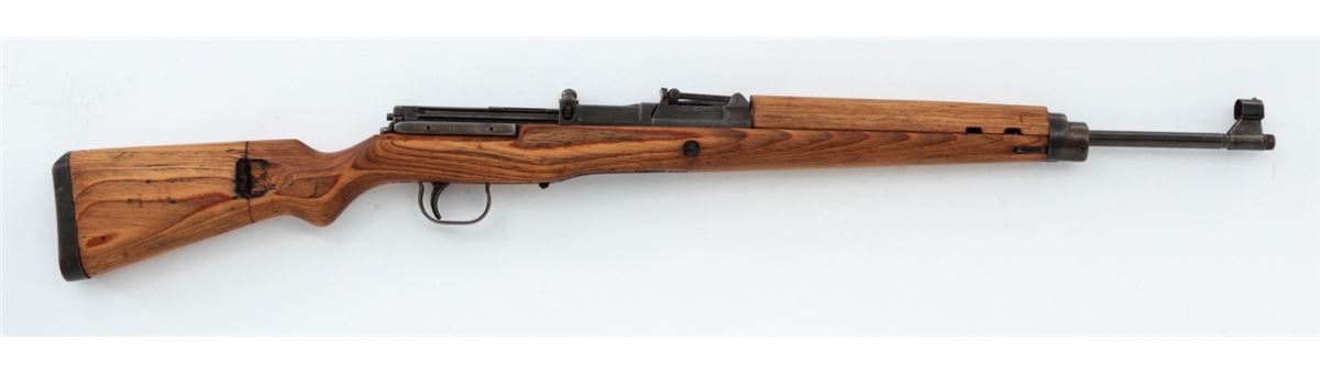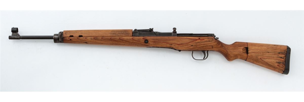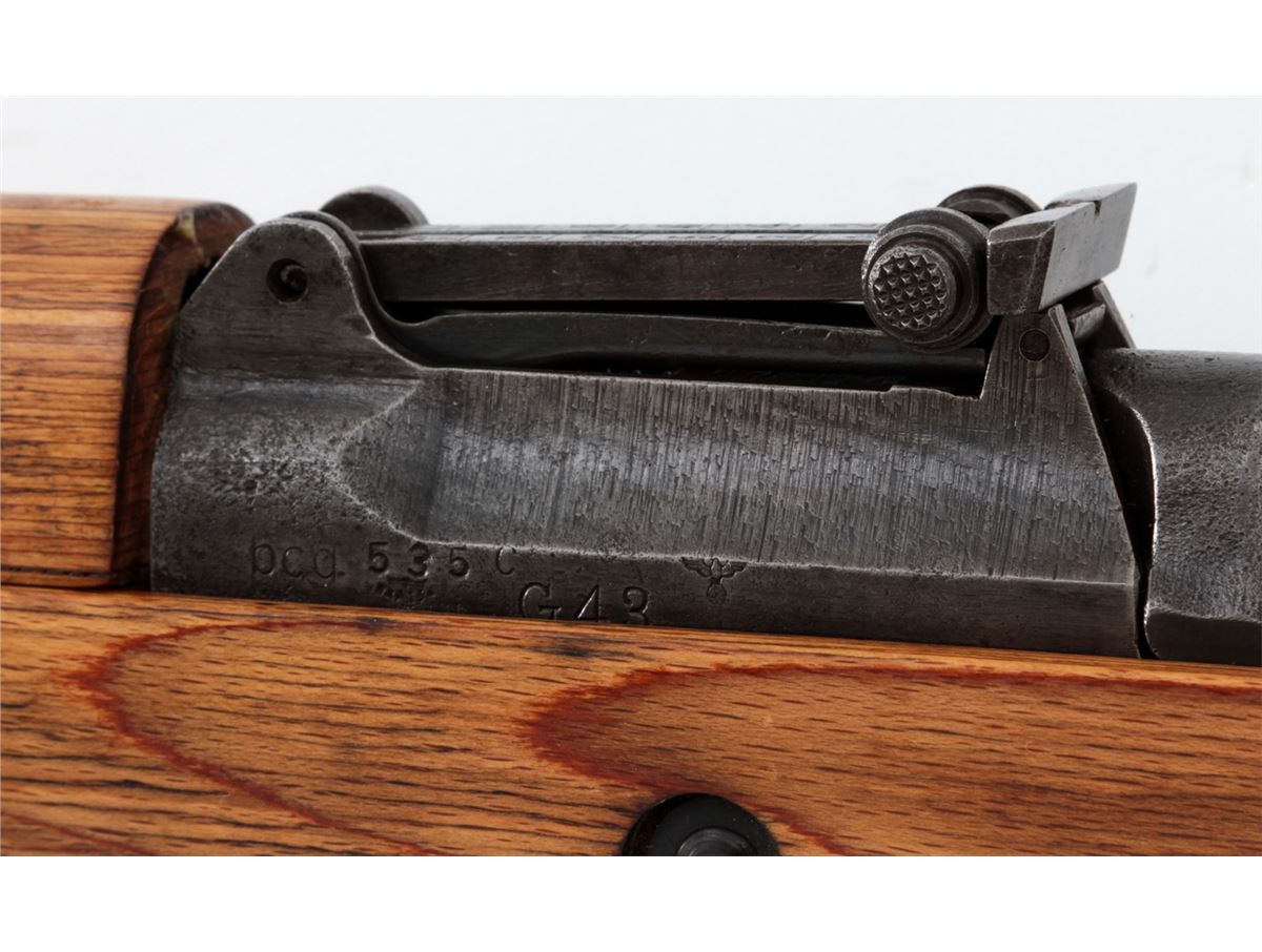 WWII German G43 Semi-Automatic Rifle, by Gusloff (bcd), #535c, 8mm, 22'' barrel, blue finish, laminated stock. Condition is good to very good retaining approx. 80% thinning blue to receiver and top of bolt carrier. Barrel and front band show evidence of refinish. Mismatched small parts. Stock with reglued duffle cut at rear sling eyelet. No magazine or cleaning rod. Dustcover and front sight hood are present. Scope rail with small drilled and tapped holes. Action is good, bore is fair. Est.: $500-$750. (C&R)