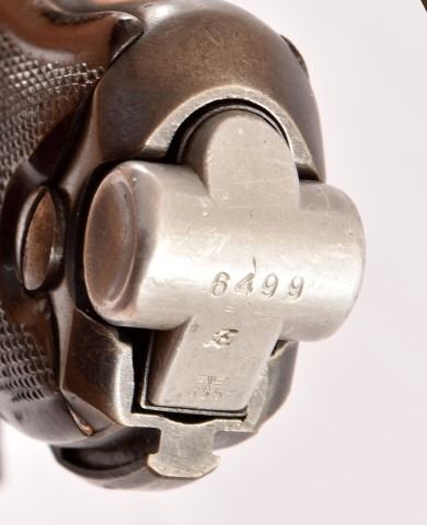 Late S date, manufactured 1935. Gun is numbers matching except for magazine. Grips are excellent, with no chips or cracks, as well as is the bore. Approx 93-95% blue, with some light thinning on the straps. Approx 50% straw colors.