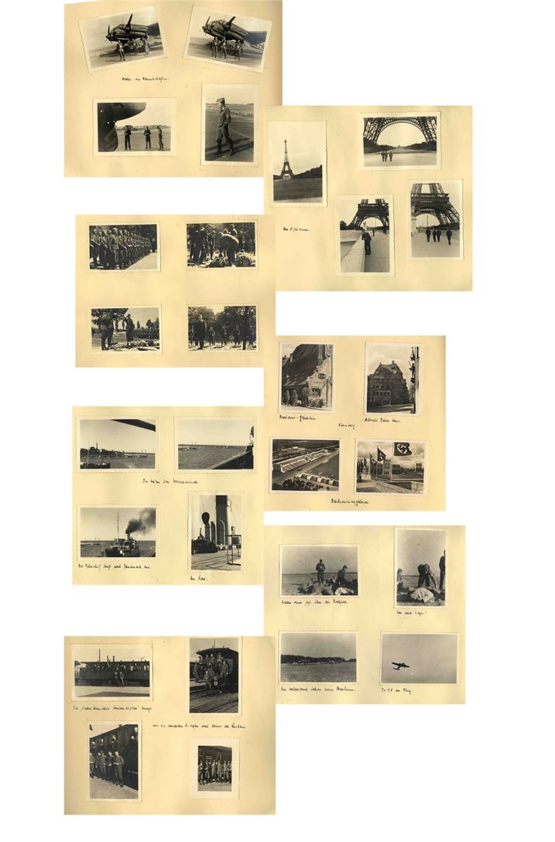 WWII Luftwaffe rare photograph album of Kampfgeschwader, Unit e8. Album comprises 189 black and white snapshots of German air power that was an essential component of Hitler's Blitzkrieg strategy. Clear captions for each photo, neatly handwritten in German. Photos chronicle winter and summer activities of enlisted men on and off duty including poses at the Eiffel Tower, airplanes on the airfield, Nazi flags flying, air crew funerals in field, a prisoner held to the ground, women swimming and more. Wood covered album with gray cloth binding measures 12.75'' x 9.25''. Cream paper has some warping and bending at paper edges, photos are near fine. Photos measure 3.75'' x 2.75'' or 2.75'' x 3.75''.