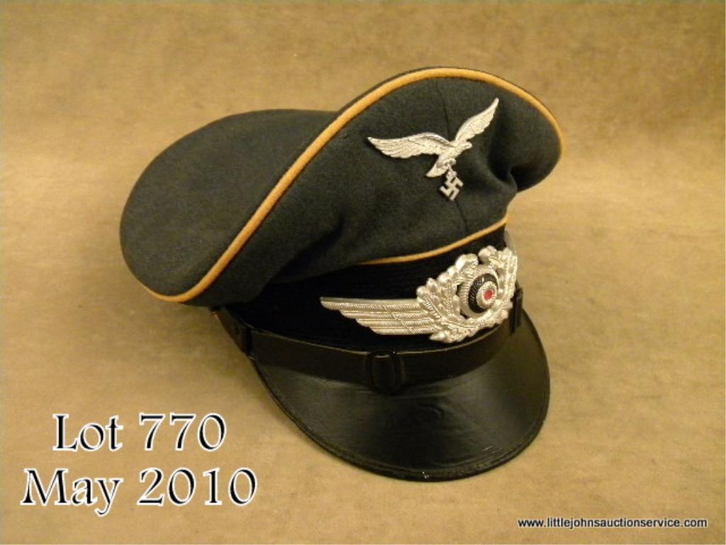 WWII German Luftwaffe enlisted/NCOs flight visor cap, complete with aluminum cap insignia, chin strap, and leather liner. Shows moderate period wear. Est: $300 - $500