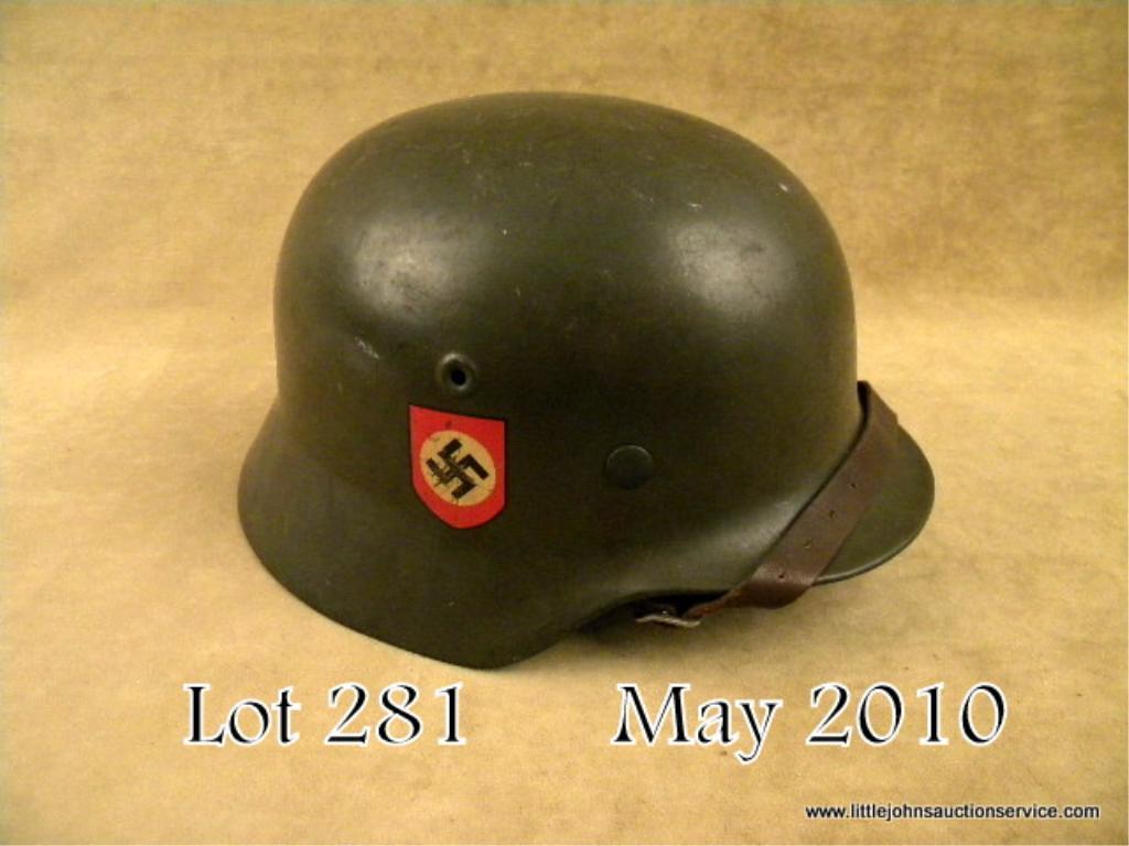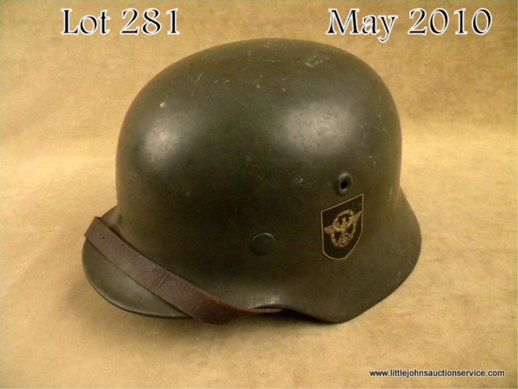 WWII German M40 double decal field police combat helmet. Helmet retains approx. 95% of the original apple green painted finish. It features a police eagle decal on the left side and party decal on the right. It is complete with the original linerand chinstrap. Very good condition. Est: $400 - $800