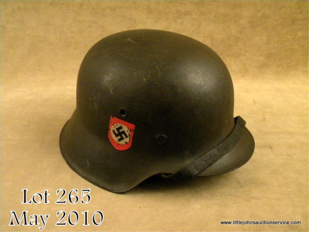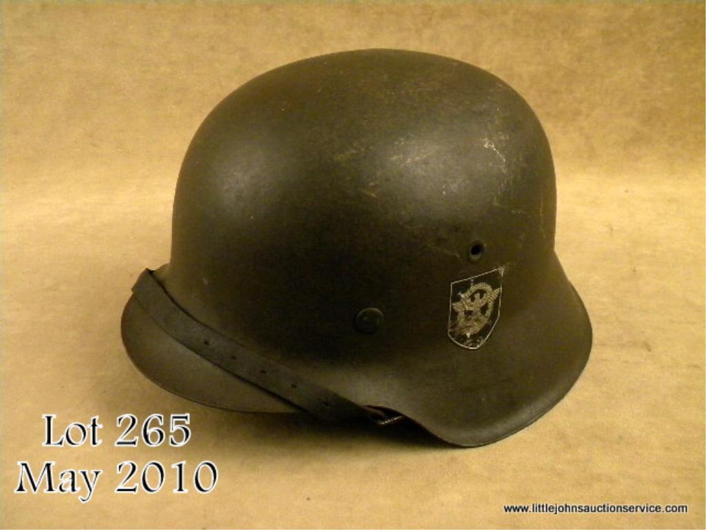 WWII German M42 double decal field police helmet retaining 95% of the original field grey painted finish. Left side of helmet features police eagle decal. Right side features party decal. Complete with original liner and chinstrap. Very goodcondition. Est: $400 - $800