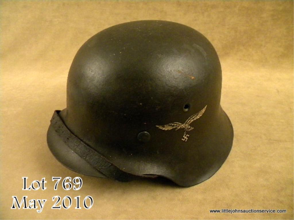WWII German M42 single decal Luftwaffe helmet retaining 95% of the original blue grey painted finish and features a Luftwaffe eagle decal on the left side. Complete with original liner and chinstrap. Very good condition. Est: $400 - $600