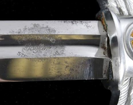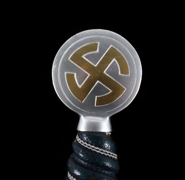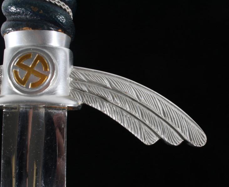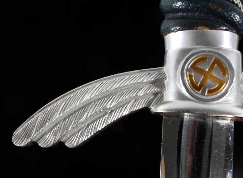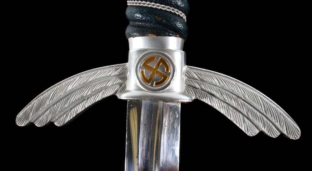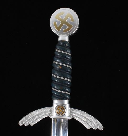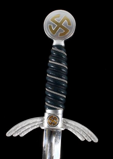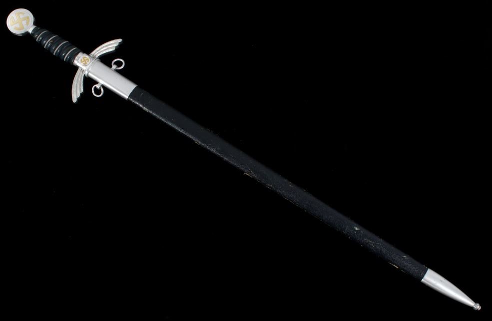 Featured in this lot we have an original authentic WWII German Nazi Luftwaffe officer's sword. The sword was manufactured by F&A Helbig as shown on the blade that is marked "F&A Helbig / Gaefler / Steinbach (KrM)" with some of the lettering having faded. The pommel shows the sunwheel swastika in brass with the outer edge stamped with oak leaves and acorns. The grip is covered in Moroccan leather wrapped with silver wire. The cross guard shows the iconic tripartite wing style with the sunwheel swastika on both sides. The scabbard shows the fine Moroccan leather wrap with nickel silver mounts. The WWII Luftwaffe sword and scabbard are in good condition overall with some light wear. The sword would have been carried by a commissioned Luftwaffe officer. Authentic examples are very rare. The sword measures 33 1/2" long overall with a 26 1/2" blade.