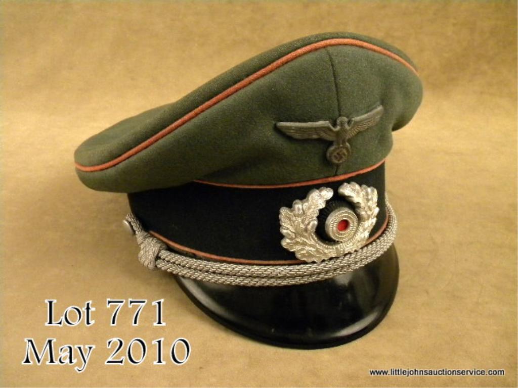 WWII German Panzer officer’s visor cap complete with original insignia, chin cords, and leather liner. Shows heavy wear from period use. Good condition. Est: $400 - $800