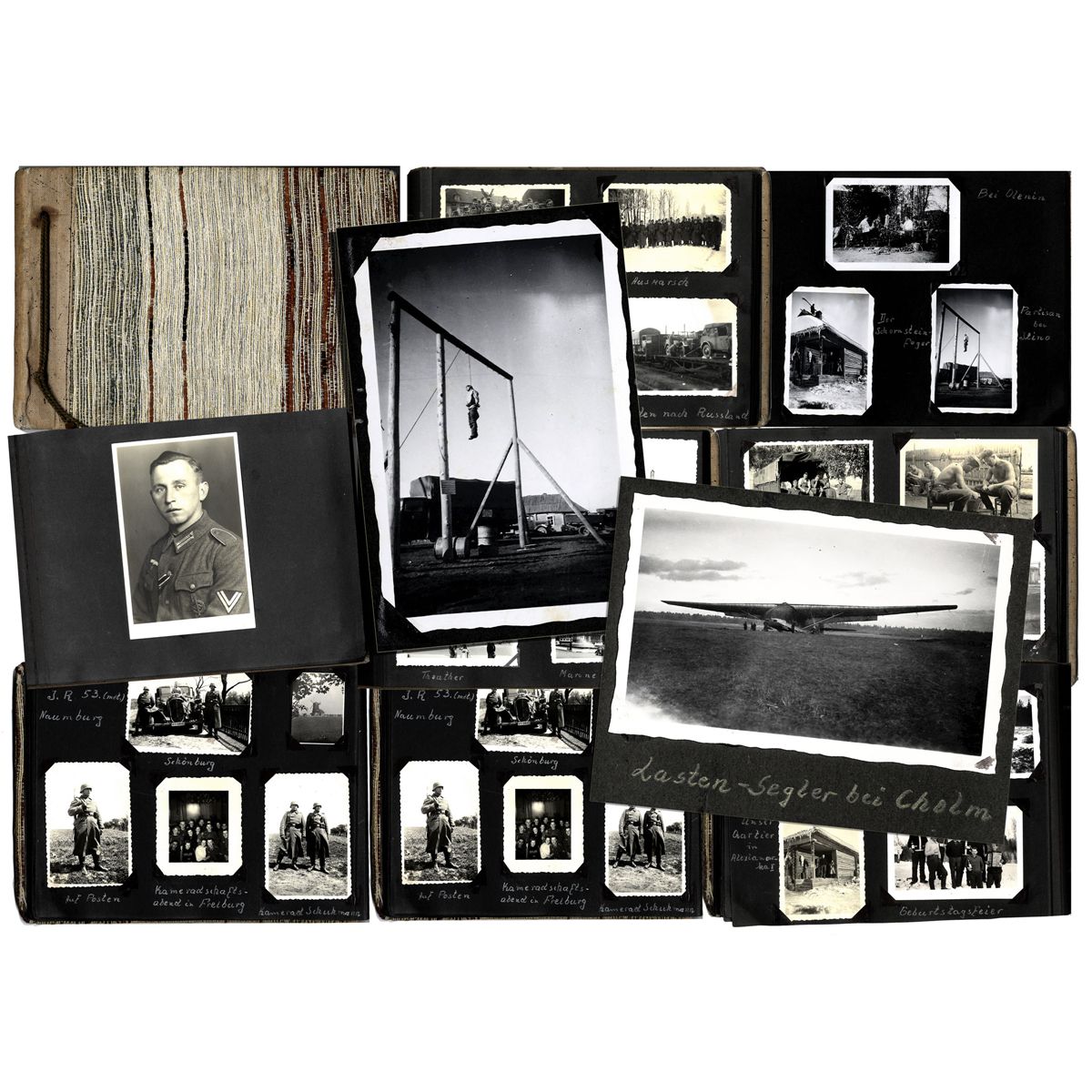 A beautiful and historic photo album featuring the self-reflective perspective of a Nazi soldier. The unnamed soldier's military portrait is adorned on the first page of the album and following are 193 of his photographs. Providing a documented view of the war through the soldier's eyes, it begins with a soldier swearing-in ceremony in 1939. Flipping through the pages, there are photos of his unit bathing, marching, at the shooting range and practicing combat simulations. As his unit starts to travel, there is a beautiful photo of the village of R'beland and its famous railroad en route to Poland. In Poland, where the War begins, there are pictures of German tanks, the collection of loot collected and graves of crosses. In 1940, the Western Westfeldzug Campaign to conquer Holland, Belgium, Luxembourg and France is documented with photos of a dead soldier and adoring crowds welcoming his Nazi troops in Magdeburg, Germany. Paris pictures indicate that he enjoyed sightseeing with photos of the Arc de Triomphe, a Parisian Cafe, Paris theater, Marine Ministry building, Notre Dame Cathedral and the Eiffel Tower. There are some photos of Austria on the Danube River including a photo of a troop lined up by the river. An interesting picture shows a train carrying military vehicles to Russia, perhaps part of Germany's ill-fated invasion of Russia. The following pages show Russian children and war-ravaged ruins. The soldier's troops headed to the Russian village of Welisk, which was captured by the Germans on 14 July 1941 and rural landscape photos of the village are included. Photos of a Russian bomber and a plane that crashed are also present. In the city of Minsk in present-day Belarus, there is a picture of the Nazi tanks on the move as well as a few photos of the city. Further, along, there are pictures of winter and the snow that would ultimately derail the Nazis and force them to withdraw. One photo shows a tank that had been destroyed and another of train tracks shattered into pieces. One of the most interesting pictures is a huge glider in Cholm, Russia where there was heavy fighting. Another photo shows a dramatic photo of a partisan hanged from the gallows. The 7.5'' x 10.5'' photo album also includes a partial marching route map for the soldier's division. Most of the photos are in very good condition with minimal fading. An exceptional collection.