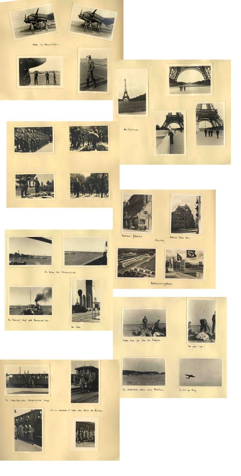 WWII Luftwaffe rare photograph album of Kampfgeschwader, Unit e8. Album comprises 189 black and white snapshots of German air power that was an essential component of Adolph Hitler's Blitzkrieg. Clear captions for each photo, neatly handwritten in German. Photos chronicle winter and summer activities of enlisted men on and off duty including poses at the Eiffel Tower, airplanes on the airfield, Nazi flags flying, air crew funerals in field, a prisoner held to the ground, women swimming and more. Wood covered album with gray cloth binding measures 12.75'' x 9.25''. Cream paper has some warping and bending at paper edges, fixed by metal screws. Minor scratching, discoloration, chipping along edges to front and back covers, else near fine condition. Photos measure 3.75'' x 2.75'' or 2.75'' x 3.75''. Very good condition.