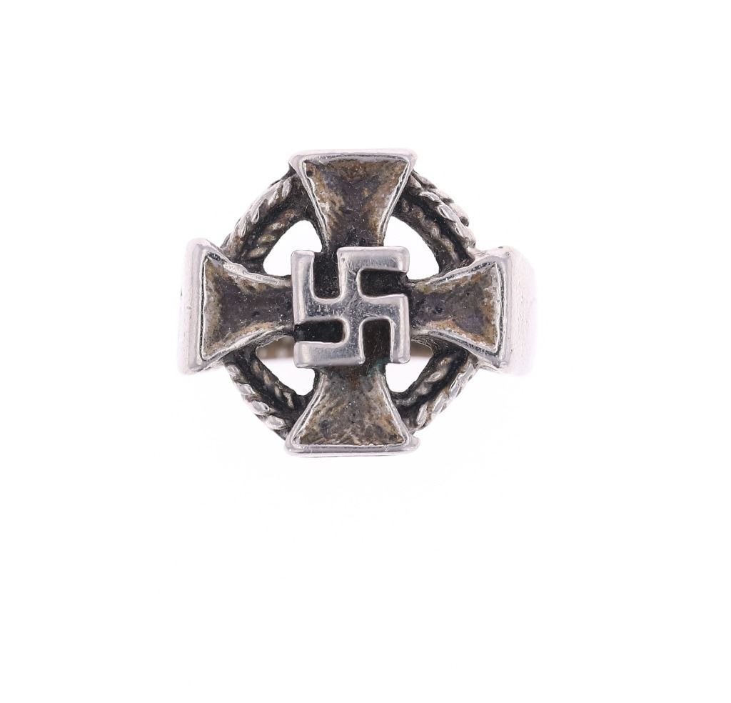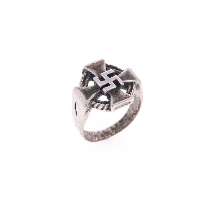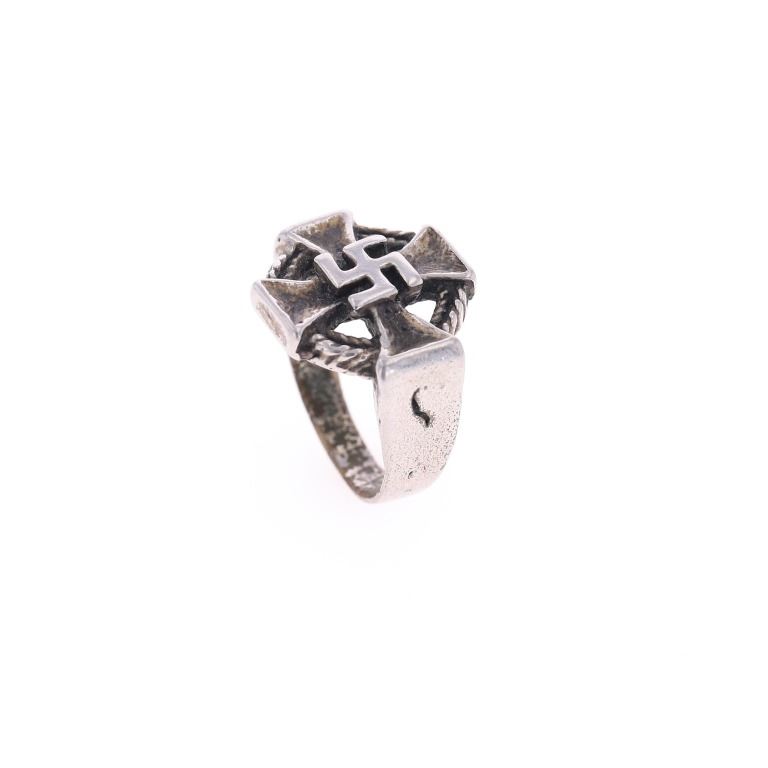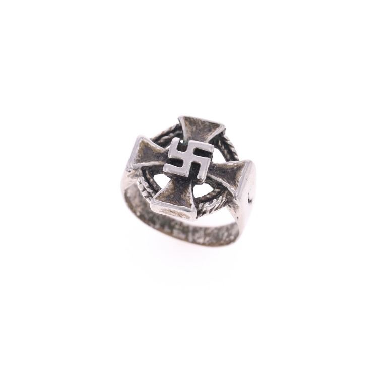 Featured in this lot is a WWII German Third Reich Knights Cross silver ring. The ring features a professionally crafted silver construction that shows the Swastika over top of a Iron Cross with a twisted rope around the outside. This ring was commonly called the Knights Cross Winner's ring. The condition of this WWII ring is preserved with some scratches to the silver but otherwise shows well preserved condition. The measurements of this ring are 1" x 7/8" x 3/4". The ring size is US 10. The collective weight of this ring is 8.2g.*