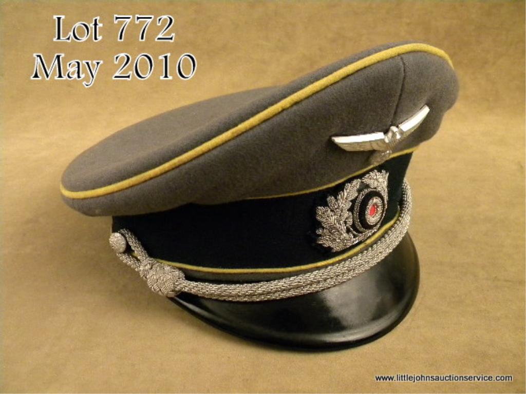 WWII German army communications officer visor cap. Cap is complete with original insignia, chin cord and leather liner. Shows moderate period wear. Good plus condition. Est: $400 - $600