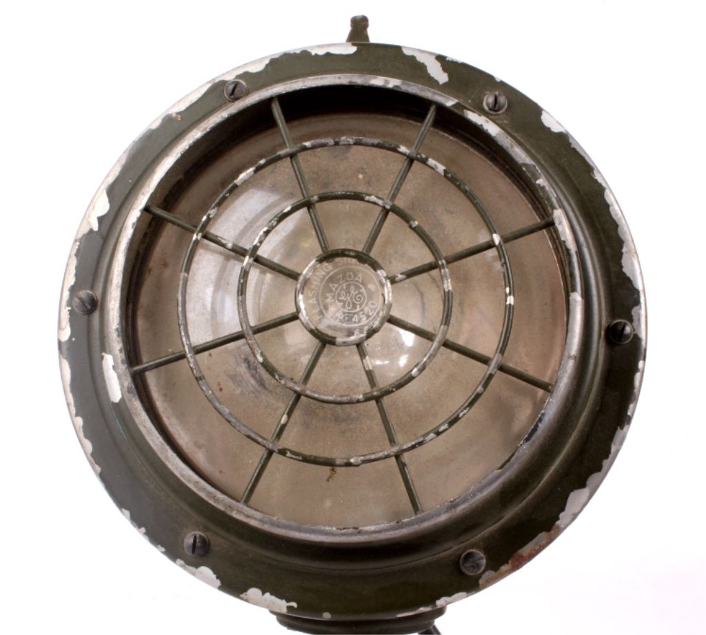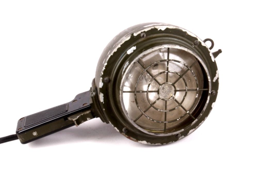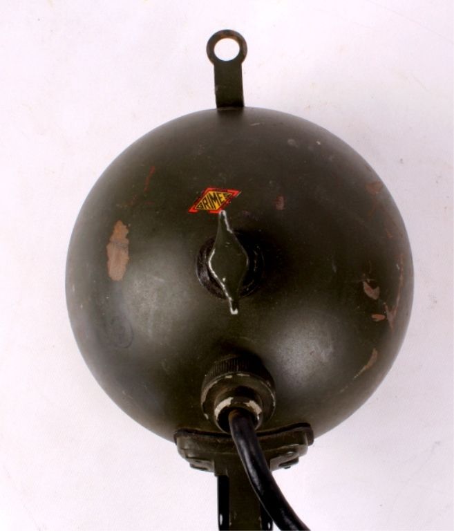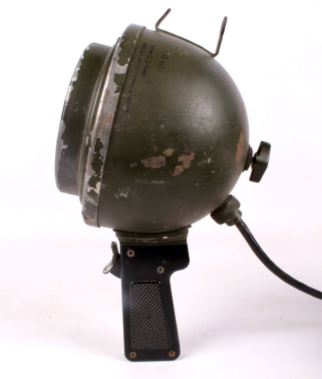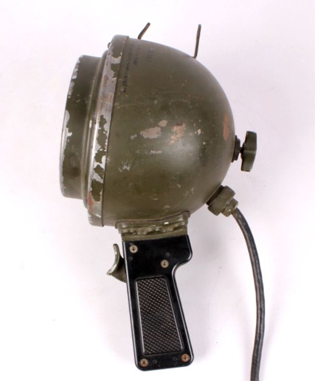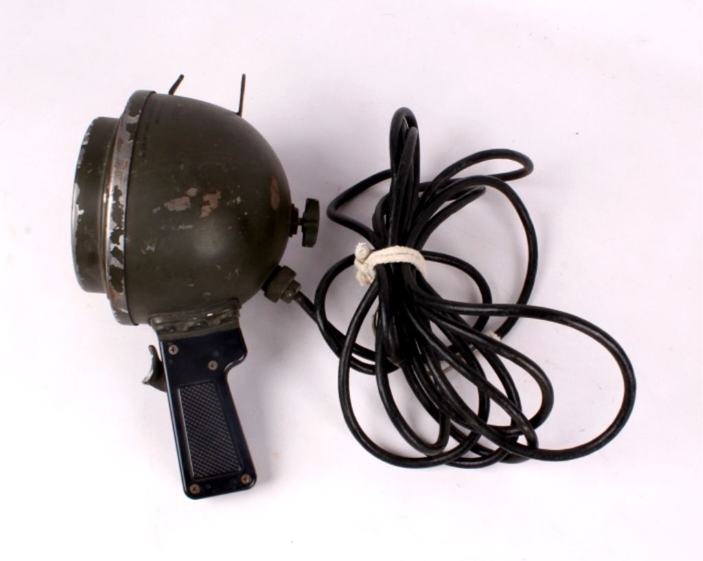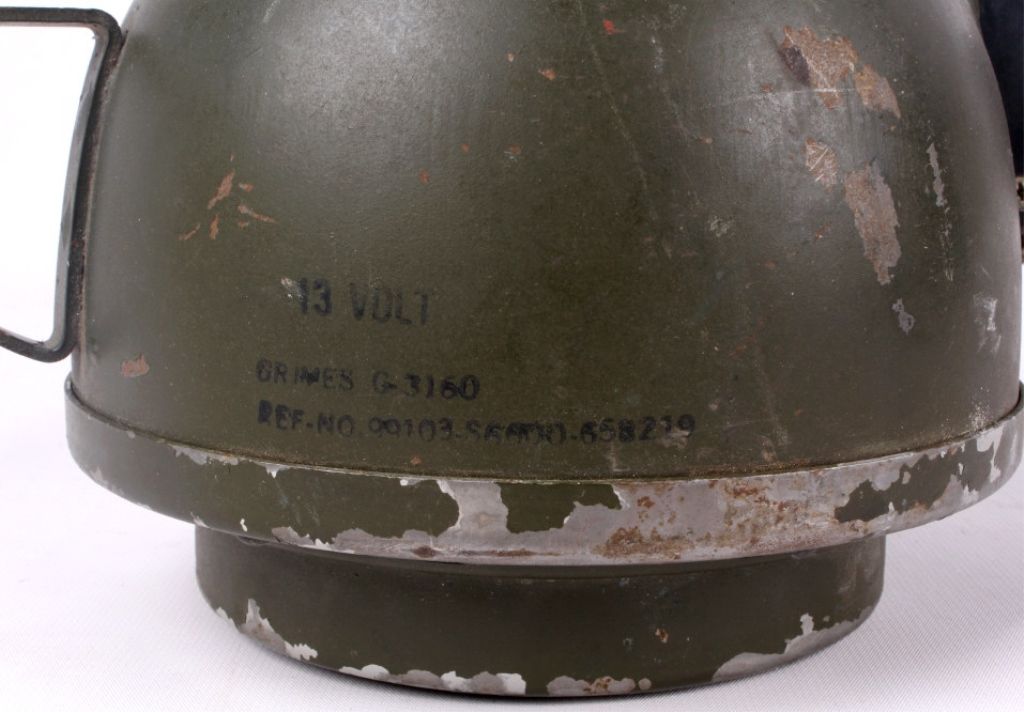 This lot features a WWII spotlight. It is a 13 volt light and is marked "G-3160". It is heavy duty and has a sturdy cage to protect the light. It measures 12" x 6" x 6".