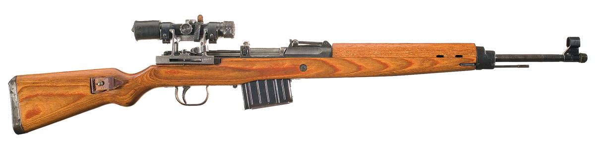This is a bcd code G43 rifle that was manufactured by Gustloff-Werke. These rifles were the first true production G43 rifles. They are characterized by the type 1 milled receiver and milled components. It is estimated that approximately only 40,000 of this type were produced with the probability that this model was assembled at the Buchenwald concentration camp under the SS, as noted in "Hitler's Garands". The left side of the receiver is marked "BCD / 44 / 9171b G43" along the bottom with an asterisk/sunburst proof mark above it. The matching bolt carrier is also the early type 2 rough cast version similar to the G41 series of rifles that retains the solid cocking knob on the left side and the bolt hold open latch on the right side without the reinforcing web on top. The action housing is the correct stamped version with the automatic dust cover. Hooded high ramp front sight, tangent rear sight graduated to 1200 meters, threaded muzzle with cover and cleaning rod. The stock and handguard are laminated and the left side of the buttstock has two faint Waffenamt proofs and the matching serial number is marked on the underside. Complete with early square end mount with an eagle 359 proof and a ZF 4 scope marked "GW ZF 4 / 21805 / ddx. triangle" on the left side with rubber eye piece and wood plug and leather objective end cover. Complete with a brown leather sling.