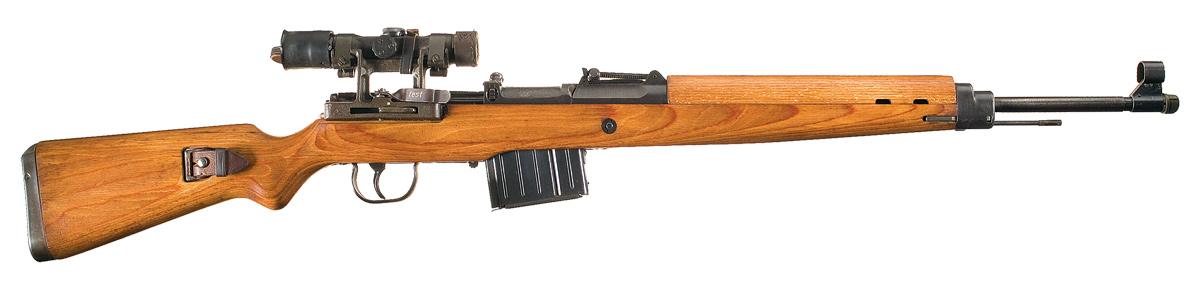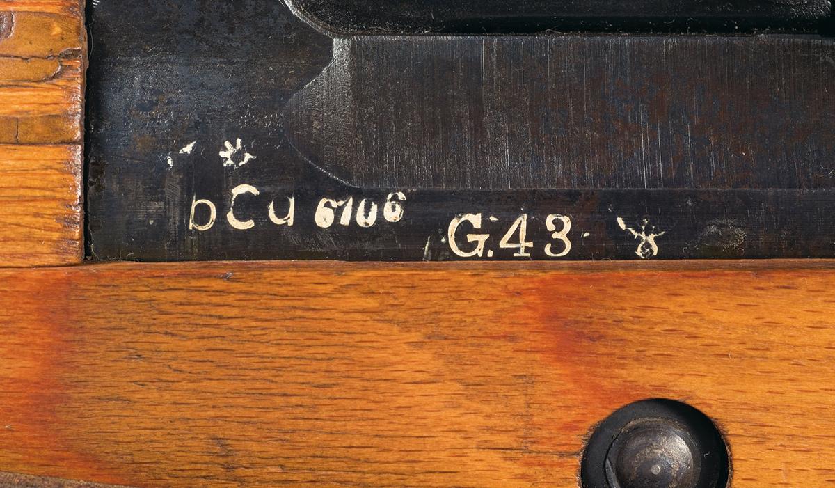 This is a nice example of a bcd code G43 rifle that was manufactured by Gustloff-Werke. These rifles were the first true production G43 rifles. They are characterized by the type 1 milled receiver and milled components. It is estimated that only approximately 40,000 total of this type were produced with the probability that this model was assembled at the Buchenwald concentration camp under the SS, as noted in "Hitler's Garands". The left side of the receiver is marked with a Nazi firing proof and an asterisk/sunburst proofmark over "bcd serial number G43 and Nazi firing proof". The matching bolt carrier is also the early type 2 rough cast version similar to the G41 series of rifles that retains the solid cocking knob on the left side and the bolt hold open latch on the right side without the reinforcing web on top. The action housing is the correct stamped version with the automatic dust cover. Hooded high ramp front sight, tangent rear sight graduated to 1200 meters, threaded muzzle with cover and cleaning rod with slotted head. The stock and handguard are laminated and the left side of the buttstock is marked with an "eagle / 359" proof and the wrist is marked with a "eagle / WaA 359" proofmark. Complete with the correct mount with an "eagle /359" proof, "558" marked at the front and correctly "fest" and "lose" marked locking lever and a ZF 4 scope marked "GW ZF 4 dow triangle / 38554" on the left side with rubber eye piece, wood plug and leather objective end cover. Complete with a brown pebble grain leather sling.