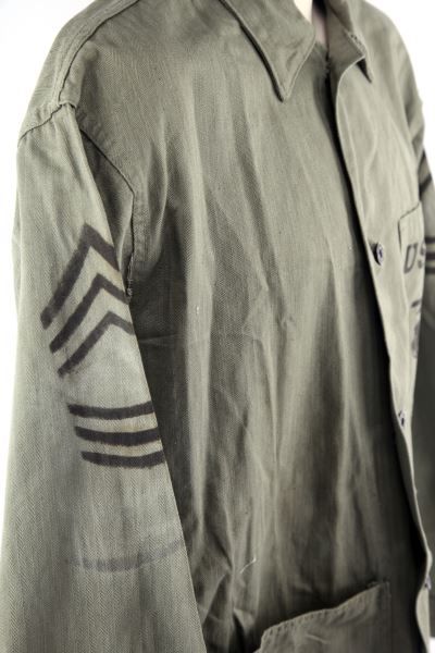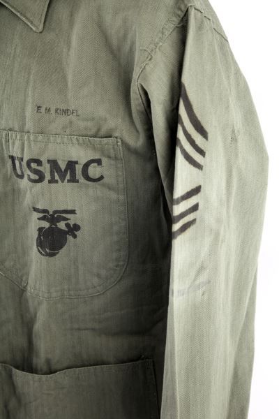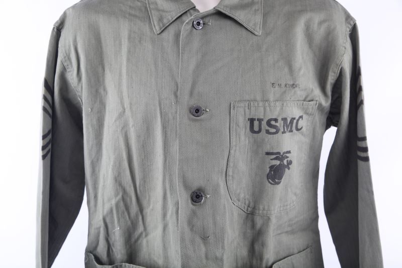 Named to E.M. Kindel, he is listed in 5th Marine Unit History as Worked in Quartermaster unit, this is a near mint Herring Bone Twill shirt, probable private purchase while serving in the Japan occupation Army, Gunnery SGT. insignia, size medium.