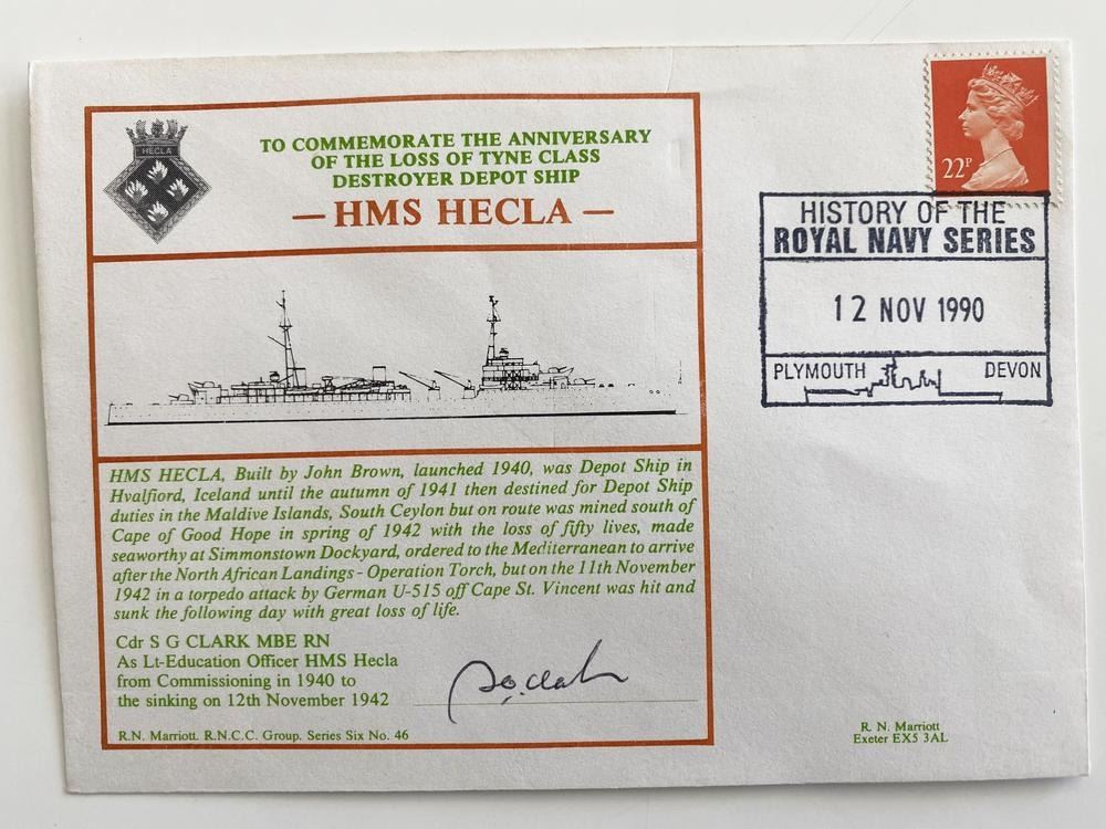 To Commemorate the Anniversary of the Loss of Tyne Class Destroyer Depot Ship Cdr S G Clark Signed First Day Cover - 12th November 1990 - Plymouth, Devon. 5x7 inches