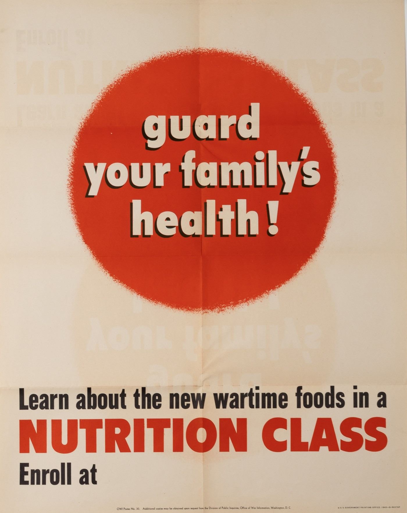 1. 'Guard your family's health! - Learn about the new wartime foods in a Nutrition Class - Enroll at', OWI Poster No. 30, U.S. Government Printing Office 1943-O-503787, 22 x 28 inches. Mailing folds. Very good. 2. 'Prepare for your war job now! Millions are needed - Short free courses', War Manpower Commission, U.S. Government Printing Office, 1943-O-533448, 44 x 20.5 inches. Mailing folds, creases, and minor loss at folds.
