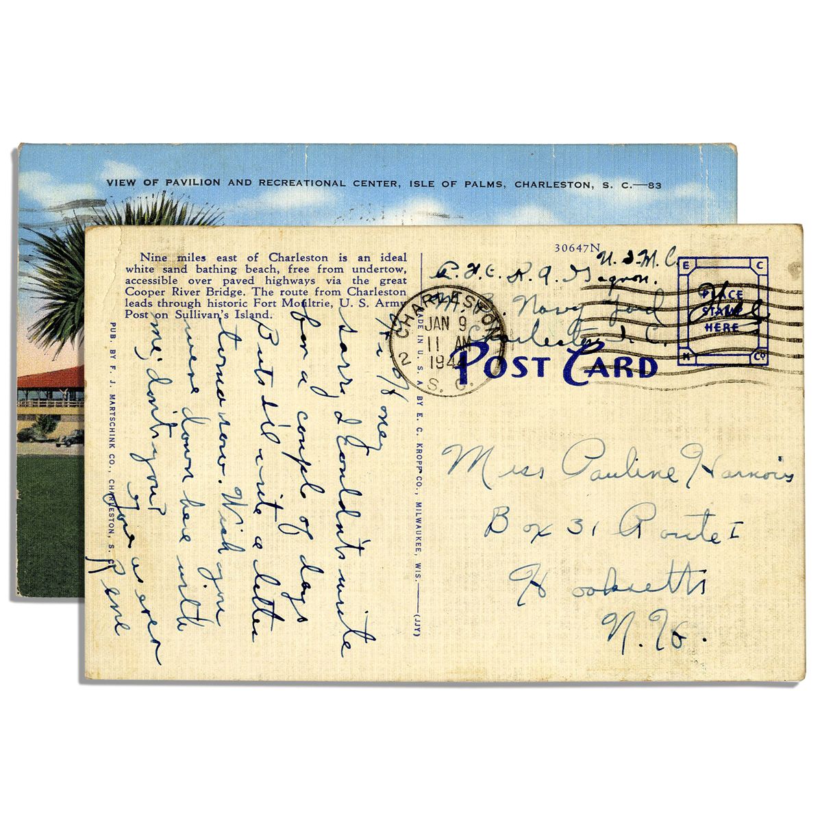 Rene Gagnon WWII autograph letter signed while serving in the U.S. Marine Corps. He writes a postcard to his girlfriend Pauline Harnois, dated 9 January 1944. While guarding the Naval Prison Camp in Charleston, South Carolina, he writes in full, ''Hi Honey, Sorry I couldn't write for a couple of days But I'll write a letter tomorrow. Wish you were down here with me; don't you? Love as ever, Rene''. He also writes his name and return address at the top edge. Card measures 5.5'' x 3.5''. Mild toning and edge wear, else near fine.