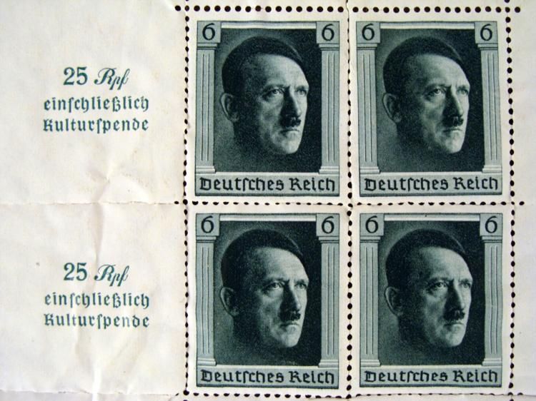 This souvenir sheet was issued on April 5, 1937 to celebrate Adolph Hitler's 48th birthday. It * includes four perforated stamps with a portrait of Adolph Hitler. In the lower margin is the inscription "WER EIN VOLK RETTEN WILL / KANN NUR HEROISCH DENKEN", which translates as "He who wants to save his people must think heroically". It is in very good condition, with wrinkling in the margins.