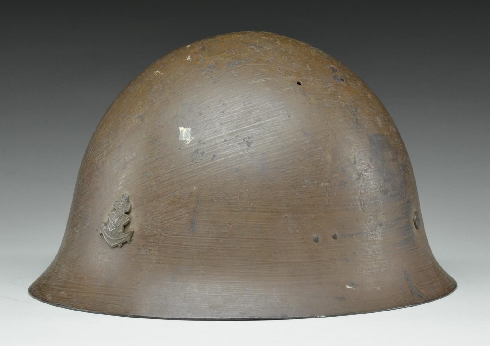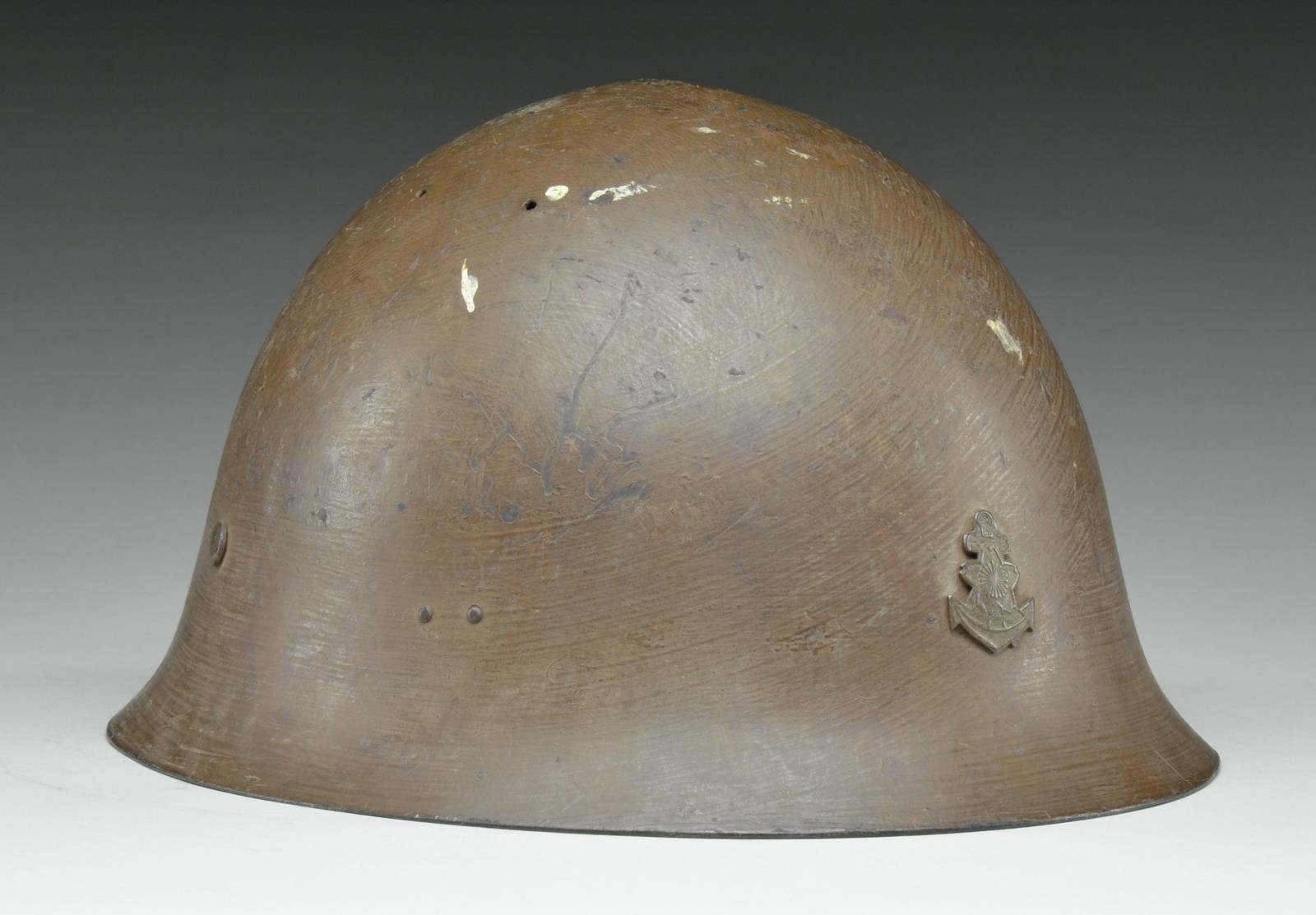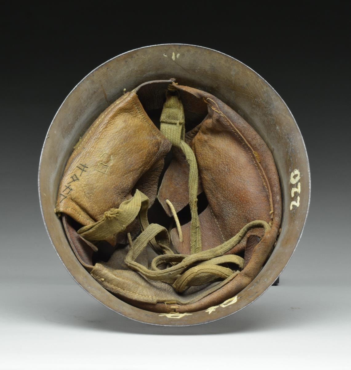 90 HELMET. A very fine helmet featuring a brown finished exterior w/ Naval Landing Forces emblem on front. Leather liner present w/ chin strap. Inner rim of helmet has soldier’s name in white painted characters w/ "220". CONDITION: fine overall w/ light wear. Liner & chin strap appear intact w/ tight stitching. (02-16199/MD/BF). $400-600.
