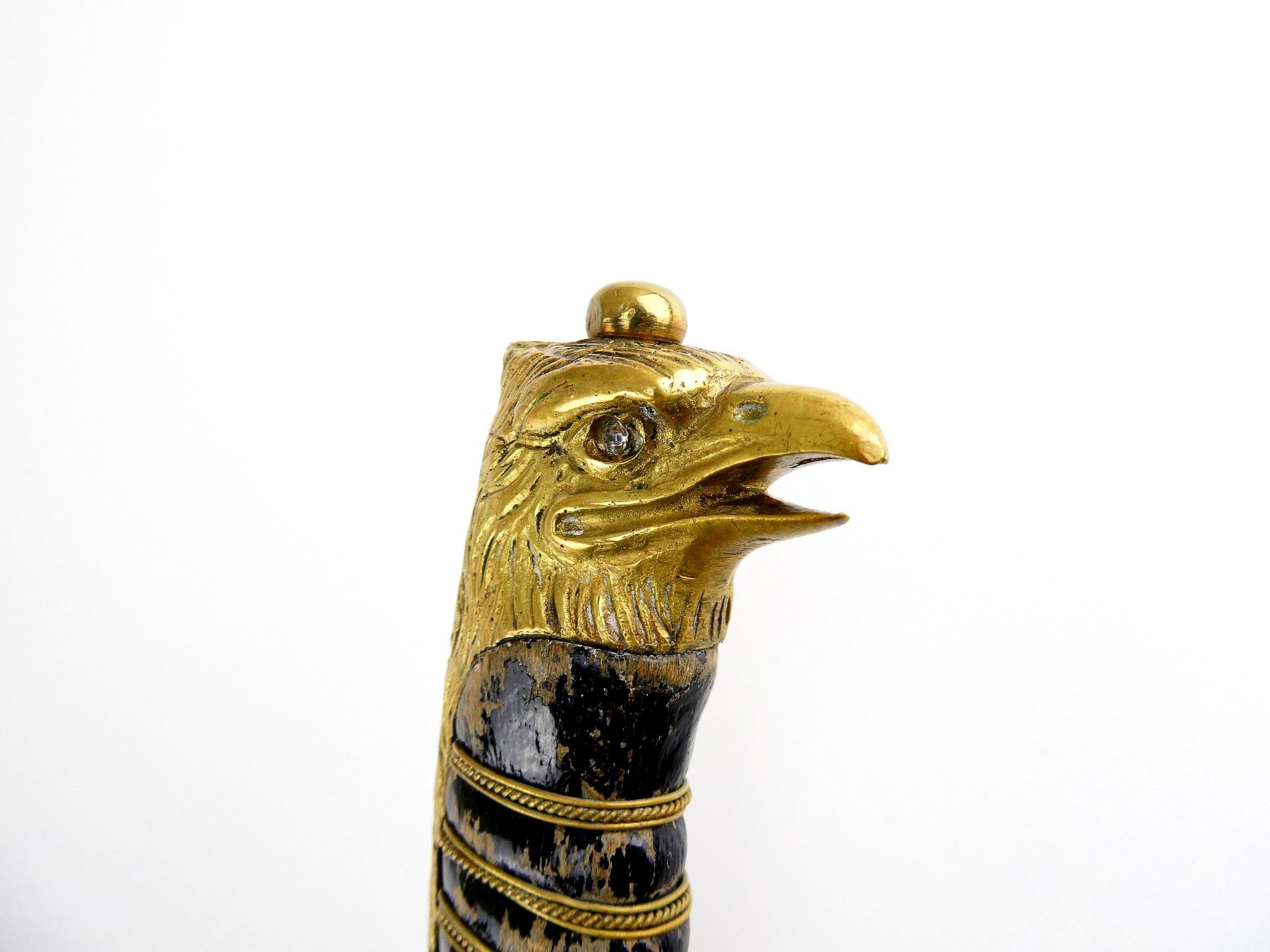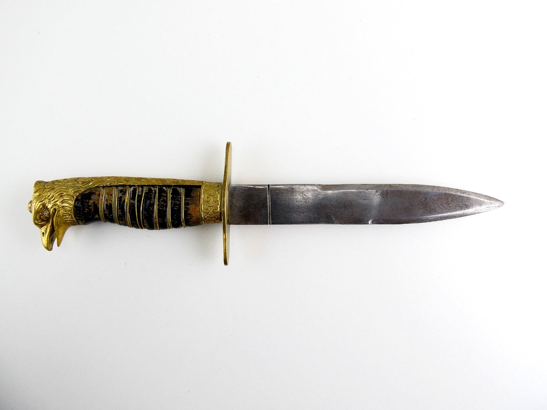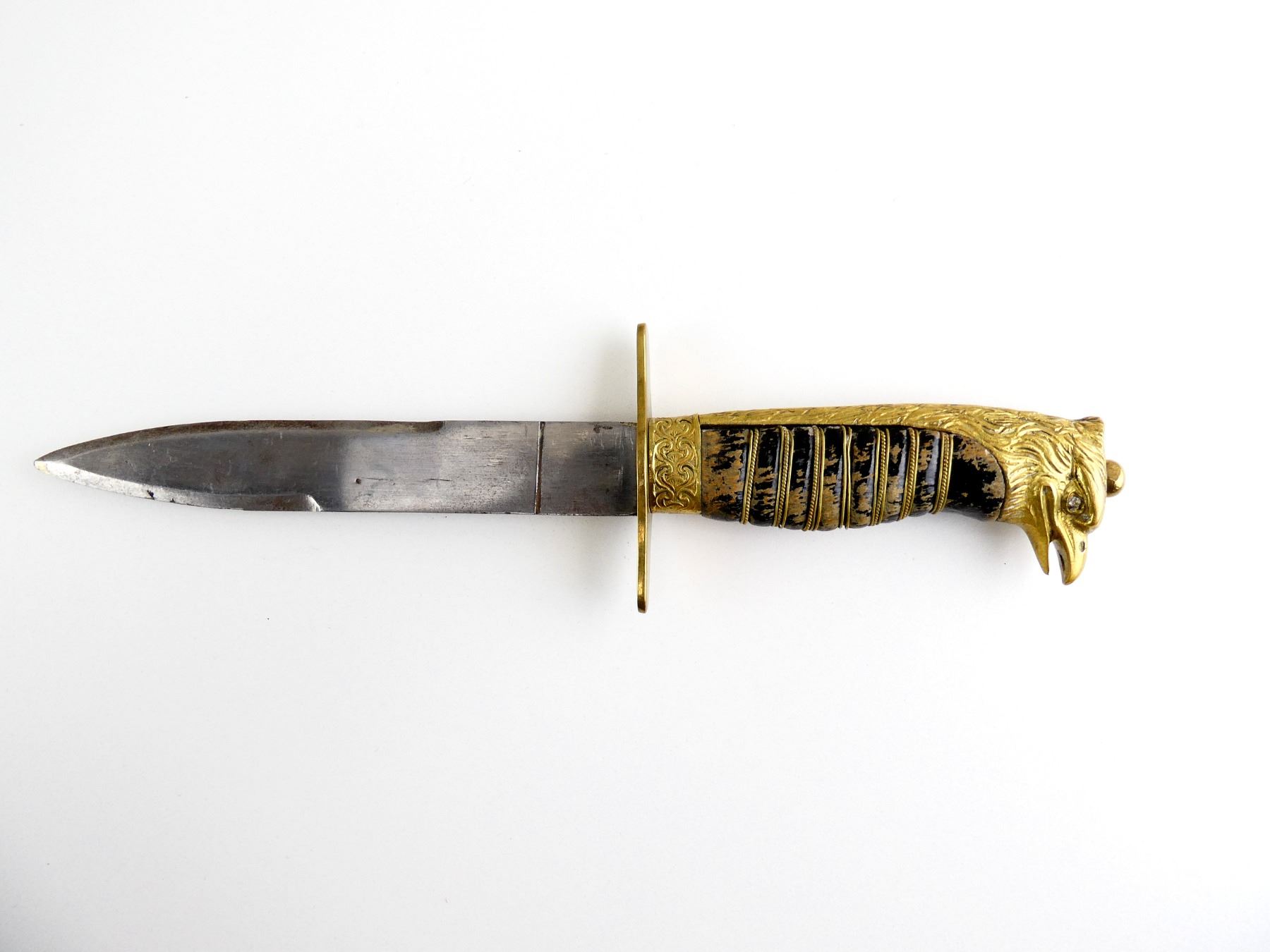 (1) FASCIST YOUTH DAGGER, DOUBLE-EDGED BLADE, NO VISIBLE MARKINGS ON RICASSO / BLADE, BRASS CROSS-PIECE, DECORATIVE BRASS PIECE BELOW CROSS-PIECE, BLACK PAINTED WOODEN GRIP WITH BRASS WIRE WRAPPING, SOME WIRE WRAP IS MISSING, BRASS EAGLE'S HEAD POMMEL WITH GLASS EYES, BRASS ALONG BACKSIDE OF GRIP WITH FEATHER DESIGN, NO VISIBLE MARKINGS, NO SCABBARD, BLADE APPROX. 6.5" & OAL APPROX. 11 1/8". SEE PHOTOS.