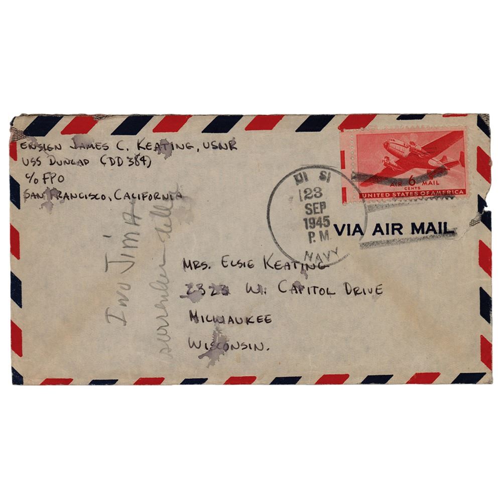 World War II-dated ALS signed by Ensign James C. Keating, "Jim," six pages on five sheets, 8 x 10.5, September 4, 1945. Keating writes home to his mother from Iwo Jima, with an eyewitness account of the surrender ceremony of the Bonin Islands. In small part: "After a short discussion, the whole party—US and Jap—came back to the fantail for the signing ceremony. That was an event I'll never forget. All the Japs were dwarfed by the burly American crew standing by—the general was a wee-fellow, bowlegged, about 60 who had great trouble with the roll of the ship. Several times members of the crew had to steady him to keep him from falling down—his hobnail boots didn't help any. Other destroyers were patrolling about us, P-51 Mustangs were flying overhead, Navy and Marines planes were swooping low over the ship to take pictures, photographers were grinding away like mad, our crew was slick and at a rigid attention—and there in the midst of this hub-bub was this beaten, little Jap general signing everything that was placed before him. It was a scene I can't do justice to—but, believe me, it was a real thrill. The end of the war was brought home to me—the treacherous enemy was doing things our way‚and offering no complaint.