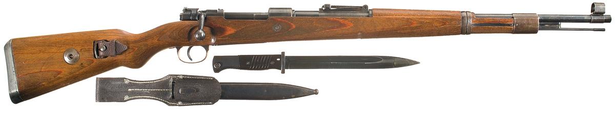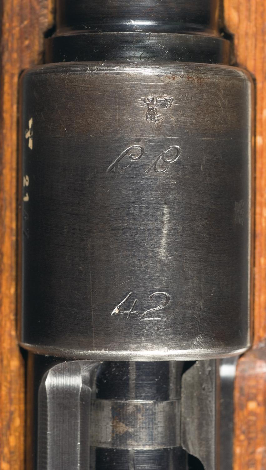 This is an example of an Early WWII K98 rifle manufactured Suhl by J.P. Sauer & Sons. The top of the receiver ring is marked with a Nazi firing proof over "ce / 42", the right side is marked with an "eagle/359" proof and the left side is marked with the firing proof and the serial number. The left side receiver wall is marked "Mod.98". The left side rear of the barrel is marked with the Nazi firing proof. The right side of the barrel directly behind the hand guard is marked with two "eagle/359" proofmarks. Hooded ramp blade front sight and tangent rear sight graduated to 200 meters. All visible numbers match. Correct early all milled parts and mounted with a laminated stock and handguard with cupped buttplate and marked with an eagle proof over "H" on the right side. Complete with a slotted cleaning rod, leather cross hatch sling and bayonet with metal scabbard and leather frog. The bayonet has a Bakelite serrated handle and blue blade marked with "MUNDLOS" on one side and "7418 / c" on the other. The scabbard is numbered to the bayonet and the back of the frog is marked "cgn / 43".