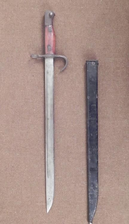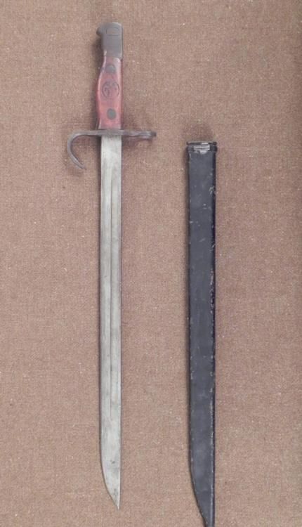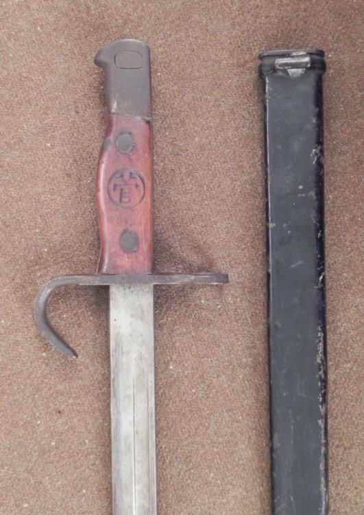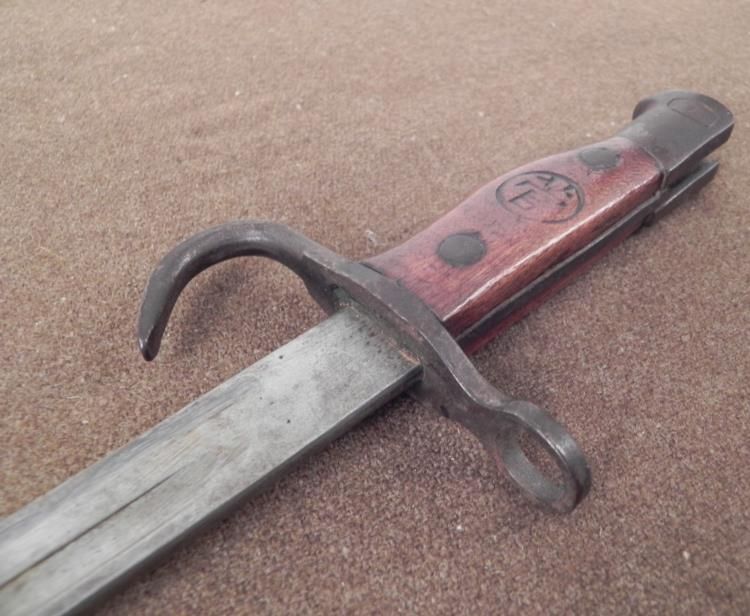 WWII JAPANESE ARISAKA RIFLE TRAINING BAYONET--BLUNT EDGE-KANJI STAMP IN GRIP 15 5/8" STEEL BLADE--ISSUE STAMP BRANDED INTO WOOD GRIP--RELEASE BUTTON WORKS FINE--HOOK CROSSGUARD--BLACK PAINTED SCABBARD