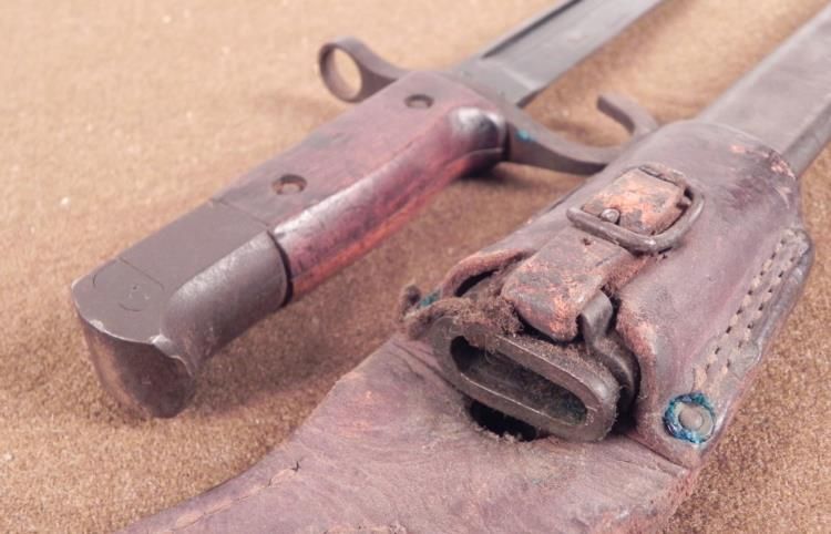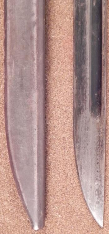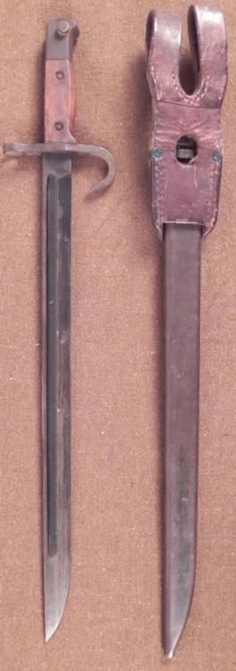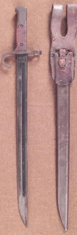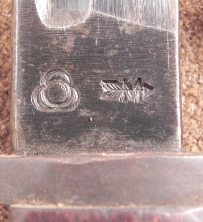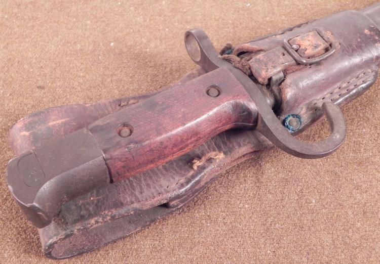WWII JAPANESE ARISAKA TYPE 30 BAYONET RARE FROG & M ARROW RARE MAKER * OUTSTANDING ORIGINAL JAPANESE COMPLETE BAYONET --BEAUTIFUL BLUED BLADE--RICASSO HAS RARE MAKER "M AND ARROW" IS A PRE-WAR TRADEMARK OF NATIONAL DENKI COMPANY (NATIONAL ELECTRIC COMPANY)-GREAT WOOD GRIPS -EARLY NO NUMBER ON TOP OF POMMEL-RELEASE BUTTON IS FINE--SCABBARD IS GREAT WITH ONLY A COUPE OF LIGHT SURFACE DINGS--COMES WITH AN ORIGINAL, HARD TO COME BY LEATHER FROG *