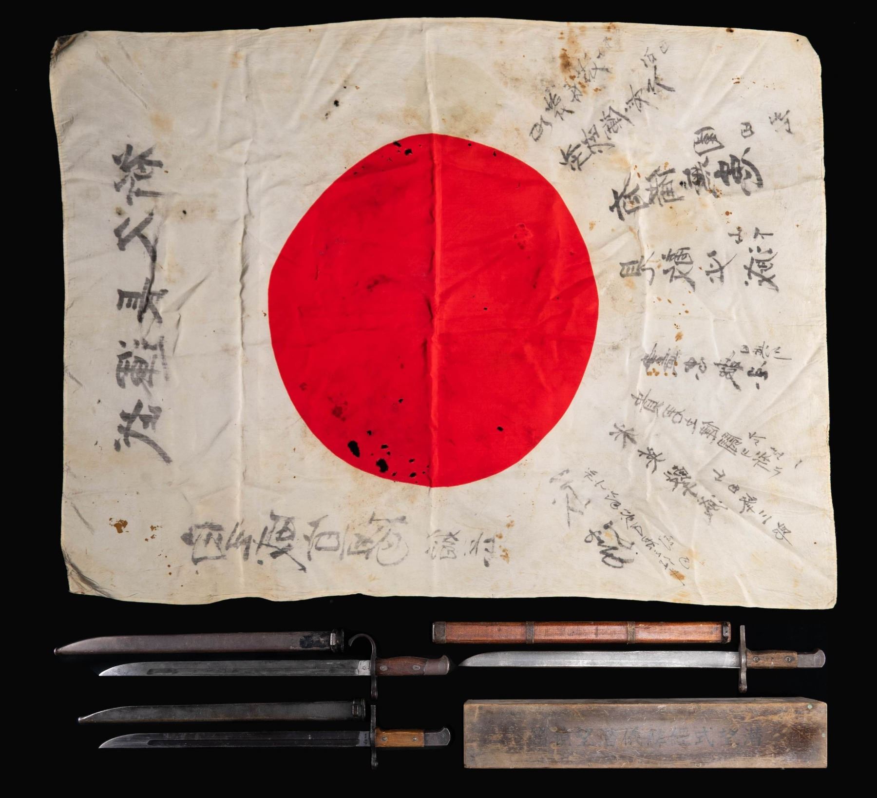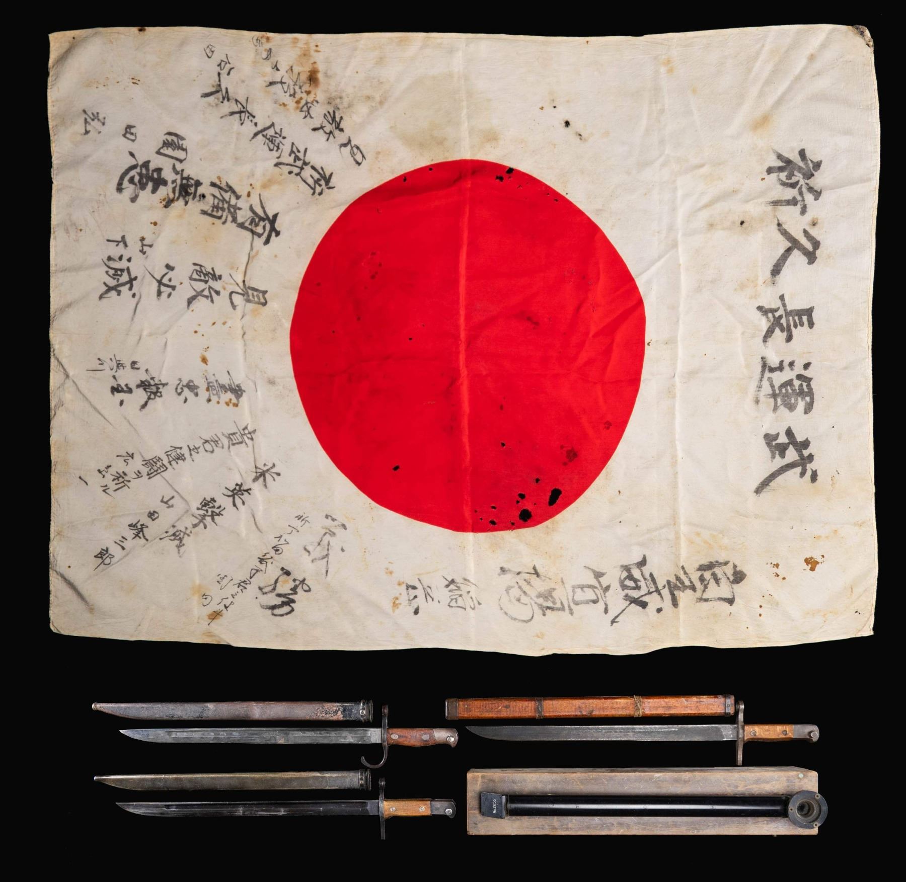 This lot consists of 1 type 30 Arisaka bayonet with a straight crossguard from the Hikari Seiki Seisakusho Arsenal with a wooden scabbard. / 1 type 30 Arisaka bayonet with a straight crossguard from the National Denki Arsenal with a metal scabbard. / 1 type 30 Arisaka bayonet with a hooked crossguard from the Kokura Arsenal with a metal scabbard. / 1 Hinomaru style silk flag with a plethora of Japanese writing upon it. / 1 Trench periscope numbered " No.2655 " in its original wood case with Japanese writing on the top. (02-24125/BF). NON-GUN. $400-700.