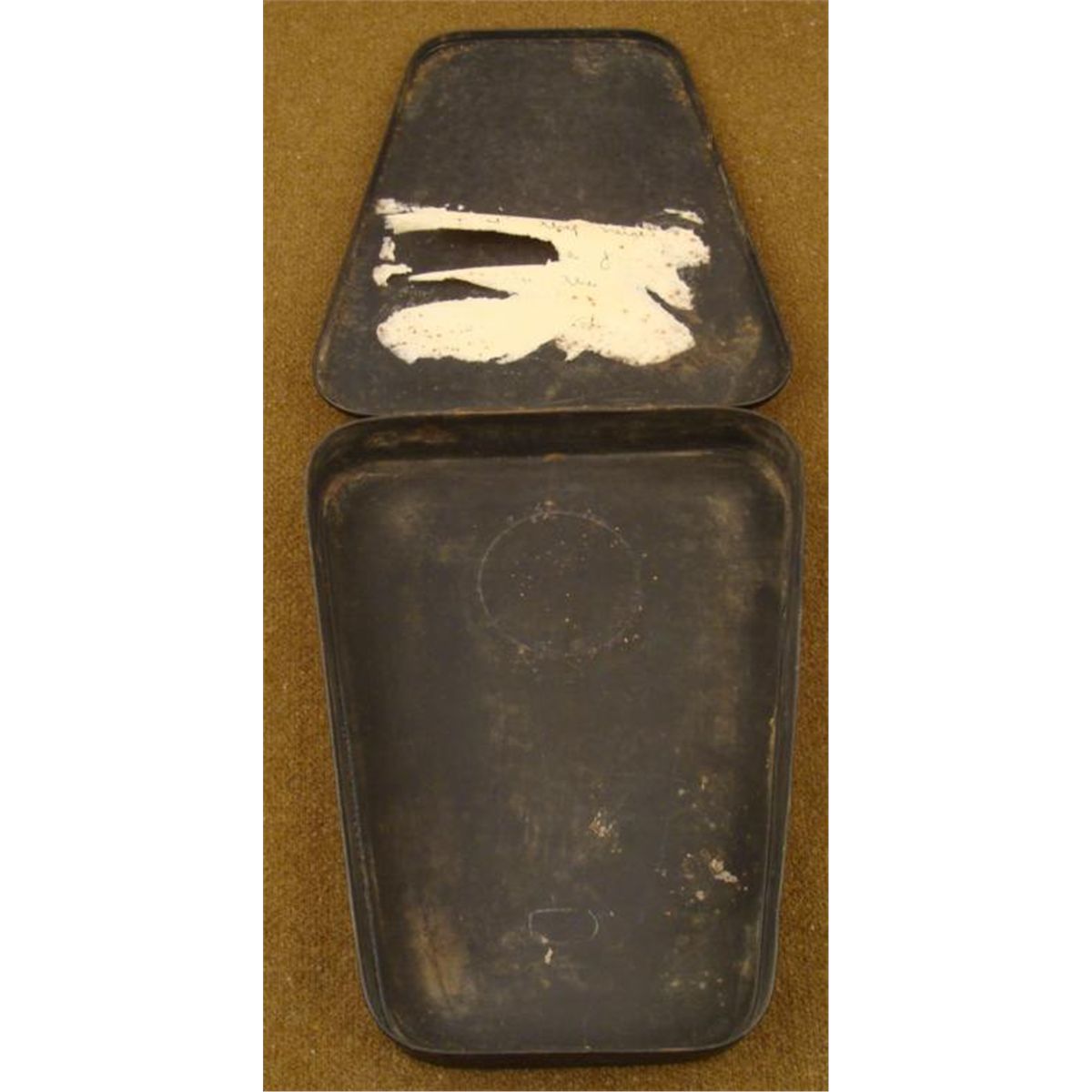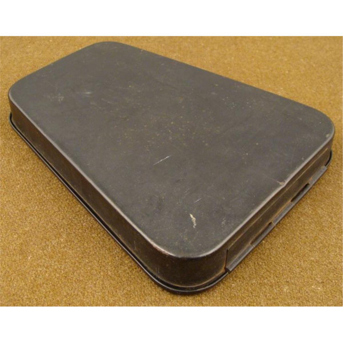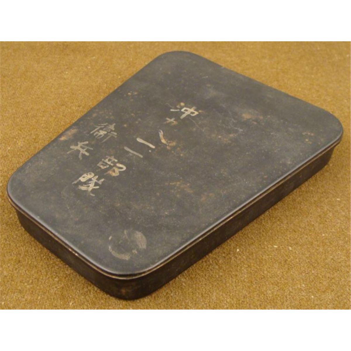 WWII JAPANESE COMBAT FIELD INSTRUMENT METAL CASE-BLACK METAL W/KANJI WRITING * INSIDE REMNANTS OF A LETTER THAT THE GI WROTE WHEN SENDING THIS SOUVENIR HOME-6" WIDE ON TOP & 7 3/4" LOND & 1" DEEP *