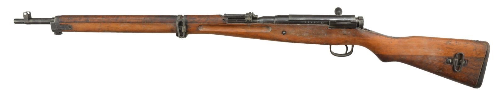 RIFLE WITH "OGEK" STAMP. Cal. 7.7 Jap. S# 13867. Bbl. 26" w/ protective blade front sight & 1500m ladder rear sight having anti-aircraft wings. Receiver ring has intact mum. Left receiver has Series 5 appearing stamp along w/ Nagoya mark. Matching numbered bolt sleeve w/ dust cover. Hardwood stock set of 2 piece construction w/ sm. recoil bolt, provision for cleaning rod, & metal buttplate. Left side of stock by recoil bolt has boxed "O.G.E.K" UNATTACHED ACCESSORIES: brown muzzle cover. CONDITION: fair pitted gray/brown patina metal w/ oxidation & marks. Toe section of buttstock & handguard appear to have different finish tones to stock. Fair overall wood finish having gouges, marks, mildew & staining. Good shiny bore. (22-1952/MD). CURIO. $300-500.