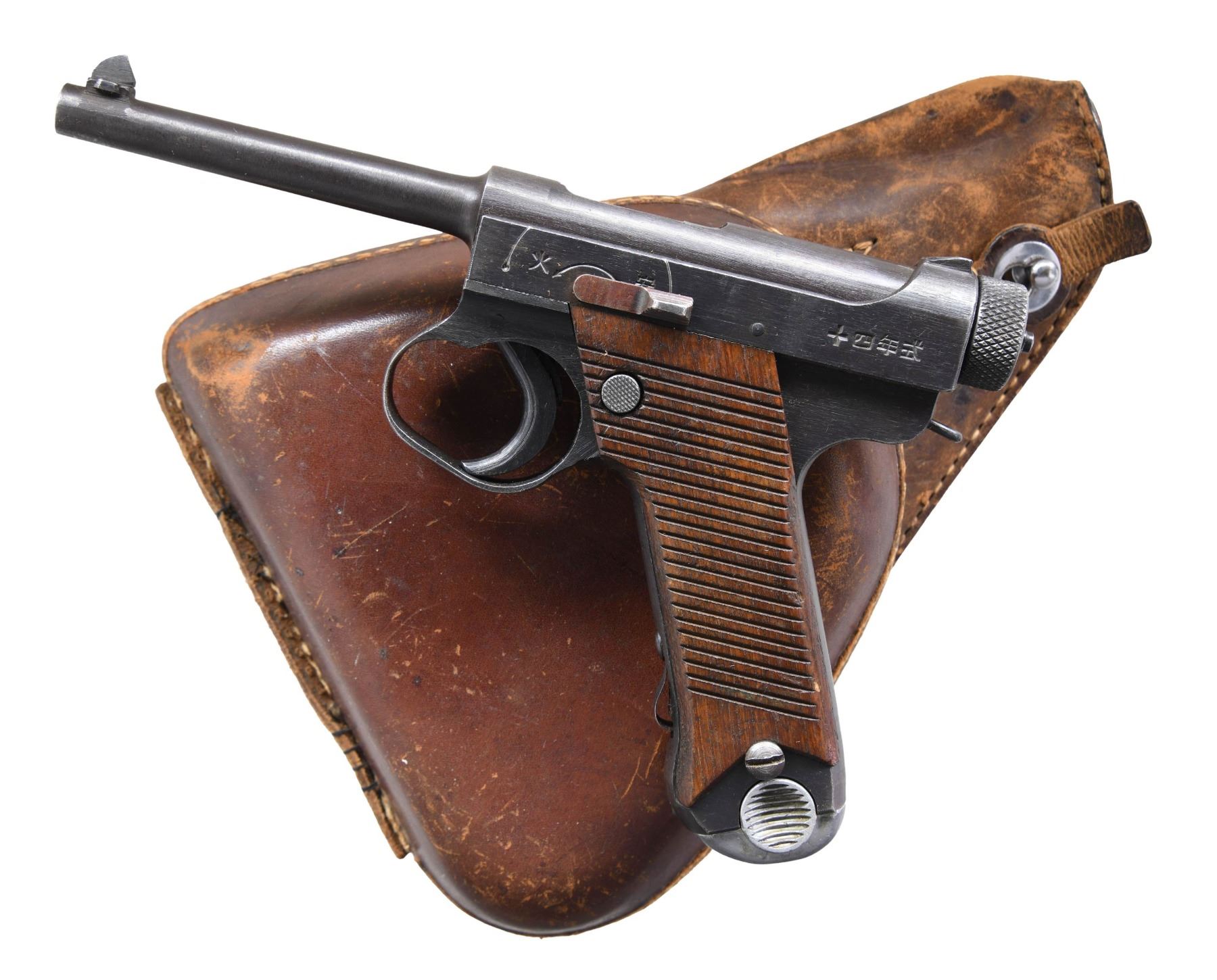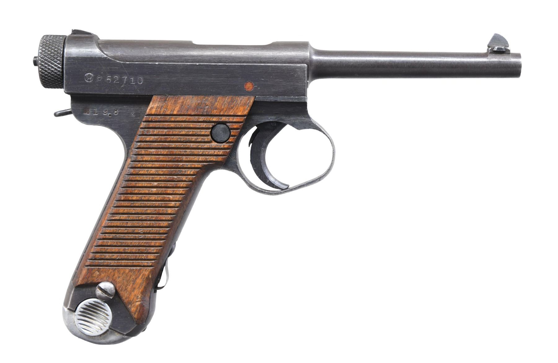 Cal. 8mm Nambu. S# 52710. Bbl. 4 ¾". Blade front sight. Fixed rear sight. Matching numbers on slide, bolt, cocking piece, and both grip panels. Firing pin is mismatched, and the extension is unnumbered. Right rear of the frame has "19.6" Showa date for June, 1943. Right rear of the slide has Nagoya and second series markings with a serial number. Blued finish with strawed safety. Grooved Asian hardwood grips. MAGS: 2-8 rd. both numbered to a different pistol. UNATTACHED ACCESSORIES: Leather clamshell holster with spare firing pin. Flap seam of the holster is coming loose. CONDITION: Grips show some dings and handling marks. Metal retains 92% of its original blue, with some edge wear, fading on straps, and dings. Action functions properly when hand-cycled. Very good bore. (24-6992/MJC). CURIO. $600-900.