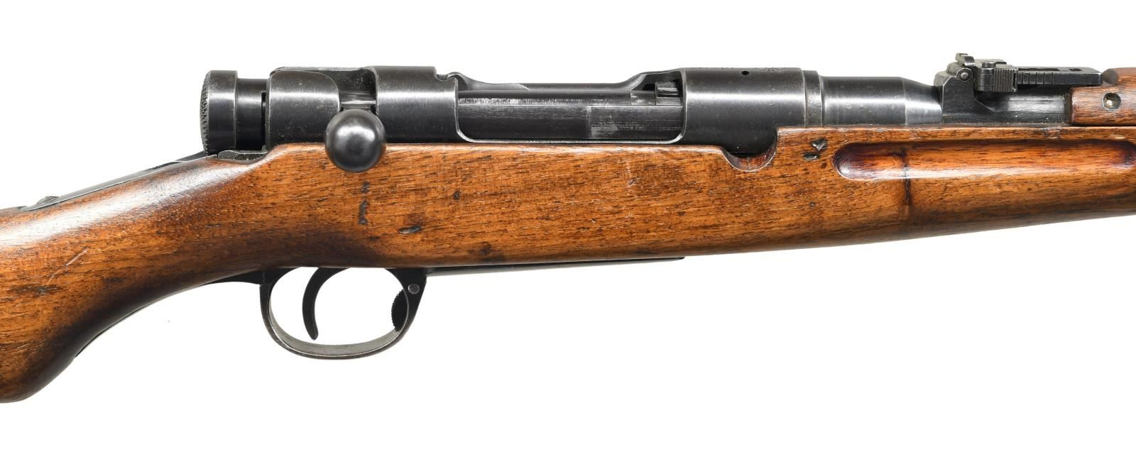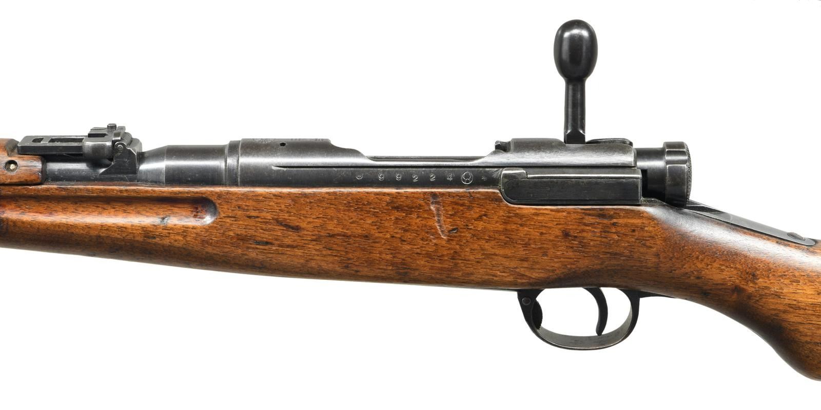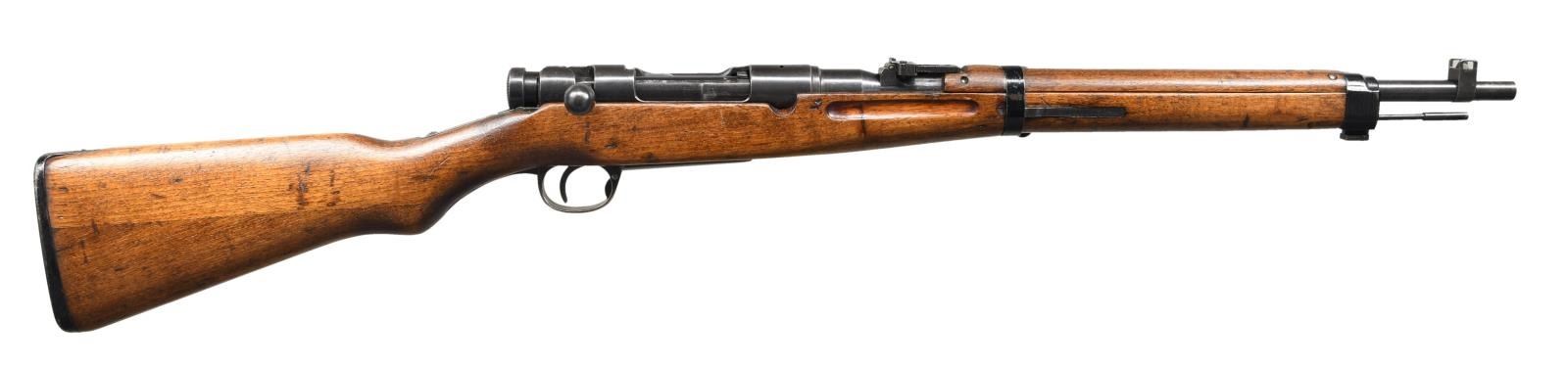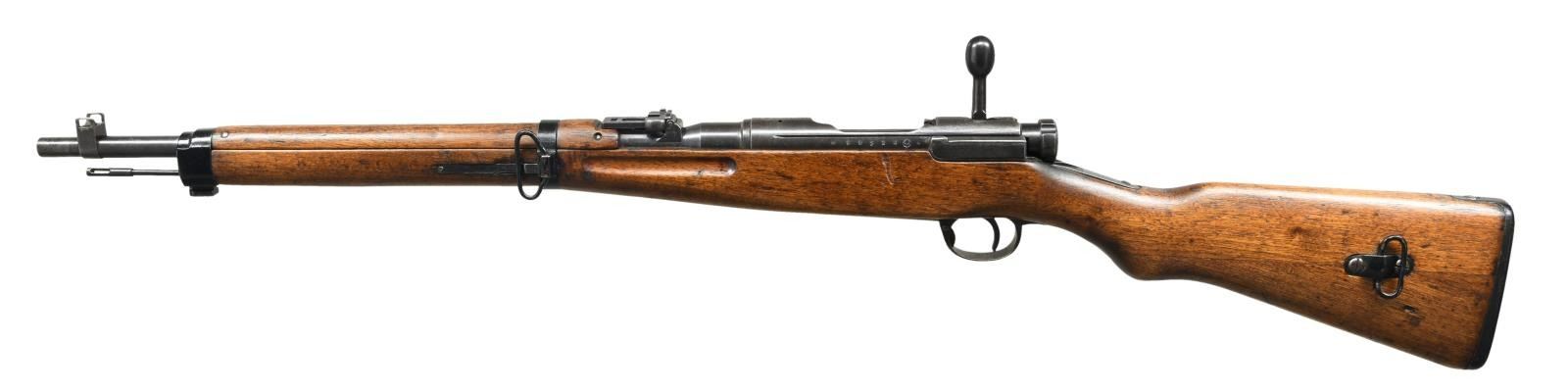 Cal. 6.5 JAP. S# 99224. Matches on receiver, bolt & bayonet lug. Bbl. 19". Ladder rear sight graduated to 2,000 yards. Inverted V front sight w/ protective ears. Receiver is marked on left side w/ Nagoya Arsenal marking. Marked on top of receiver ring w/ intact crisp "mum" & "Type 38" markings. Straight bolt handle. Checkered notched safety knob. Hardwood stock set. Buttstock has typical 2 piece construction. Cup type buttplate. Side swivels. Cleaning rod is present. CONDITION: stock set has arsenal rework type finish w/ added finish. Bolt, trigger guard & receiver parts have 70% original thinning finish w/ light wear. Balance of parts have added gloss black finish. Fair worn bore turning dark in grooves. (23-2227/RW). CURIO. $300-500.