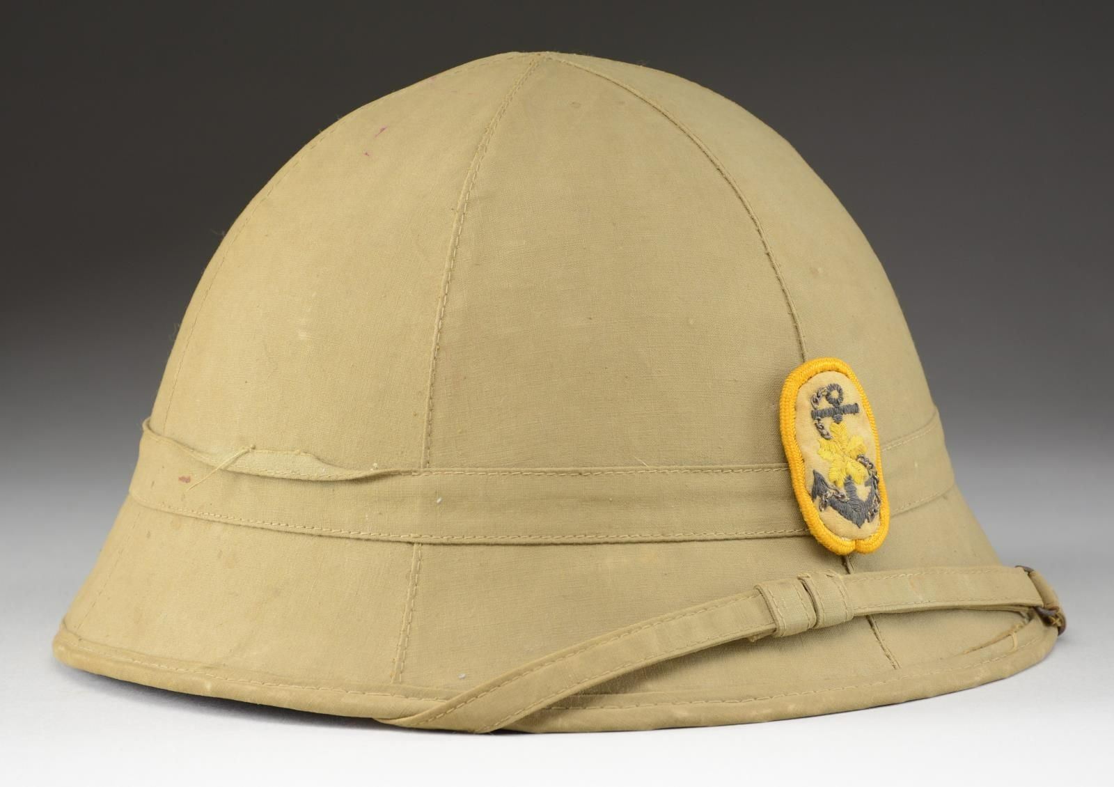 This rare helmet has a khaki cotton 6-piece sewn exterior with a cloth Naval anchor & cherry blossom on the front. The interior liner is dark green cotton with a khaki cloth chinstrap & suspension band. There are 2 sewn-in white cotton tags with Japanese characters. CONDITION: helmet shows light wear overall with no significant staining or damage. PROVENANCE: From the Lifelong Collection of Glen E. Mattox. (02-18437/BF). $400-700.