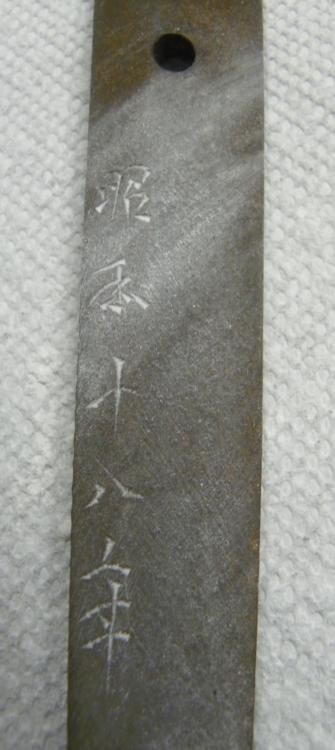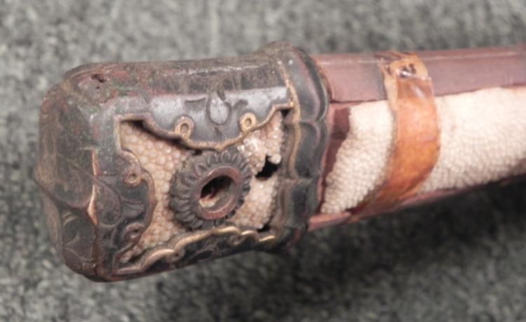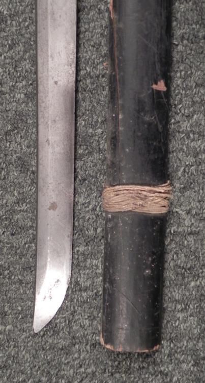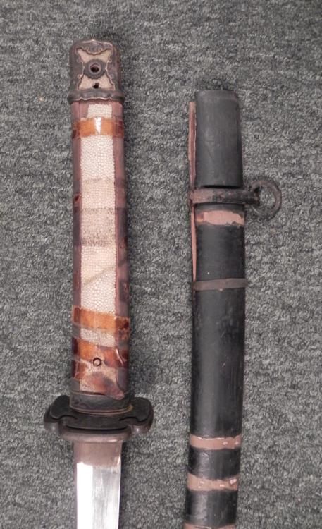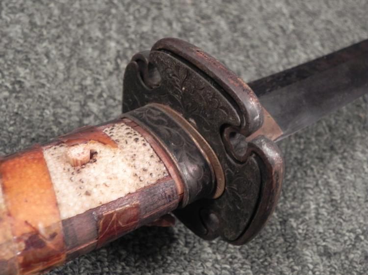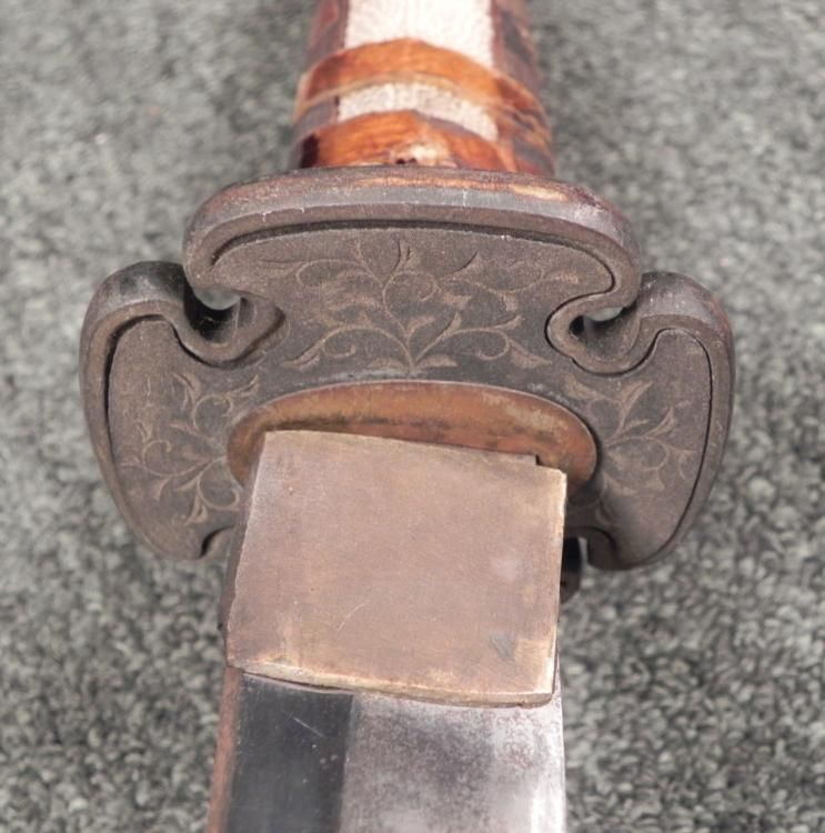 WWII * JAPANESE SAMURAI SWORD GENDAITO KATANA-SIGNED KAZUNORI-SHOWA JU HACHI NEN * (1943) * * ORIGINAL * WWII GENDAITO SAMURAI FORGED BY A SHRINE SMITH "KAZUNORI" ON * TANG-REVERSE DATED SHOWA JU HACHI NEN-(WHICH IS 1943)--SHOWS AGE AND WEAR-26 * 1/4" LONG BLADE--BLADE HAS BLOTCHING, BUT SHOWS SOME ZIG-ZAG * HAMON/TEMPER LINE--TSUBA IS A MULTI-PIECE WITH TOP A BOTTOM ETCHED THIN * LAYERS ON TOP OF THICK CENTRAL TSUBA-FUCHI AND KABUTO-GANE (POMMEL CAP) MATCH * TSUBA--SAME IS PRESENT ON GRIP, BUTHANDLE WRAP IS NOT PRESENT--KISSAKI (BLADE * POINT) HAS A SLIVER NOT PRESENT-SCABBARD IS IN ROUGH CONDITION--NICE ORIGINAL * 1943 SMITH MADE GENDAITO SAMURAI SWORD IN NEED OF SOME TLC