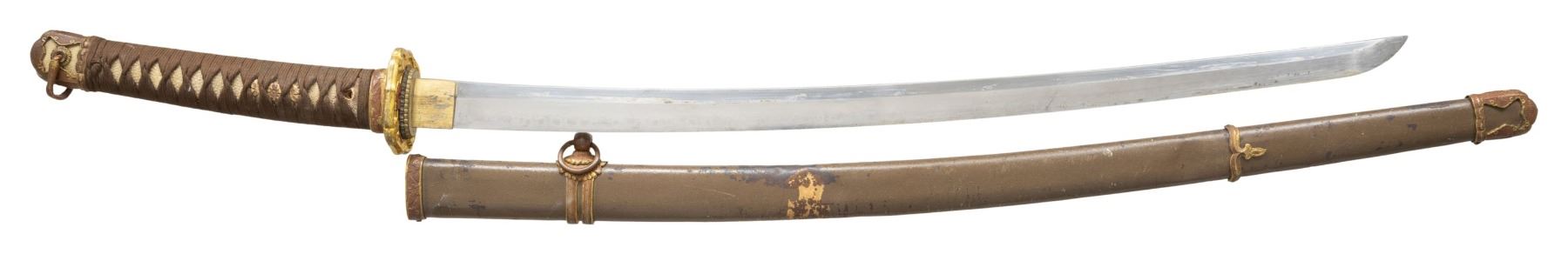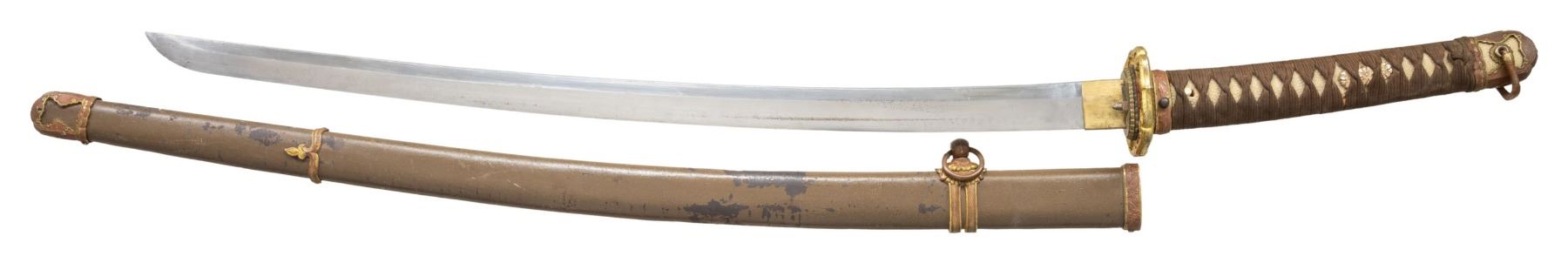 A nice shin-gunto katana measuring 40 1/2" overall with a 25 3/4" blade. Blade has a irregular hamon and a gilded copper habaki. The nakago has a single mekugi-ana and an 6 character signature on one side. The gilded brass tsuba has a classic 4 cherry blossom design on both sides with 4 seppa above and 2 seppa below. Matching fuchi and kabuto-gane. Dark brown tsuka-ito with white same and gilded 3 cherry blossom menuki. Olive green painted saya with matching gunto. CONDITION. blade has a good polish. Tsuka shows light wear but the saya shows some paint loss and 1 shallow dent. (02-24099/BF). NON-GUN. $400-700.