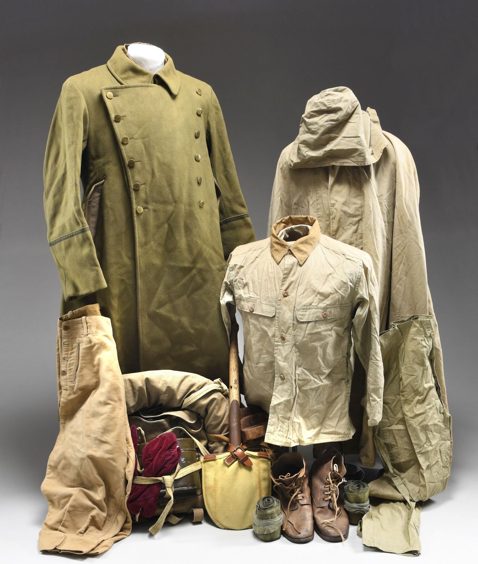 MATERIAL. This large and varied lot of WWII Japanese military items includes 1 pair of khaki brushed cotton mounted uniform pants. / 1 backpack with attached shelter section. / 1 mess kit. / 1 pair of wooden sandals. / 1 pair of slipper-socks. / 1 entrenching shovel with canvas and leather carrier. / 1 pair of brown leather short boots. / 1 pair of field green puttees. / 1 pair of coveralls with plain round composite buttons. / 1 pair of summer-weight fatigue pants with a tie string waist. / 1 summer-weight fatigue shirt with plain wooden buttons and internal Japanese ink stamps. / 1 long uniform coat with coconut buttons and red cloth collar insignia featuring two yellow stars. The uniform has several internal Japanese ink stamps. / 1 heavy officer's wool overcoat with plain brass buttons and two sewed in Japanese interior labels. / 1 apparatus that appears to be an electrical junction terminal. / 1 type 96 or 99 IMG bipod bracket. CONDITION: all items generally show light wear. Boots and sandals show moderate wear. (02-24298/BF). $1,200-1,800.