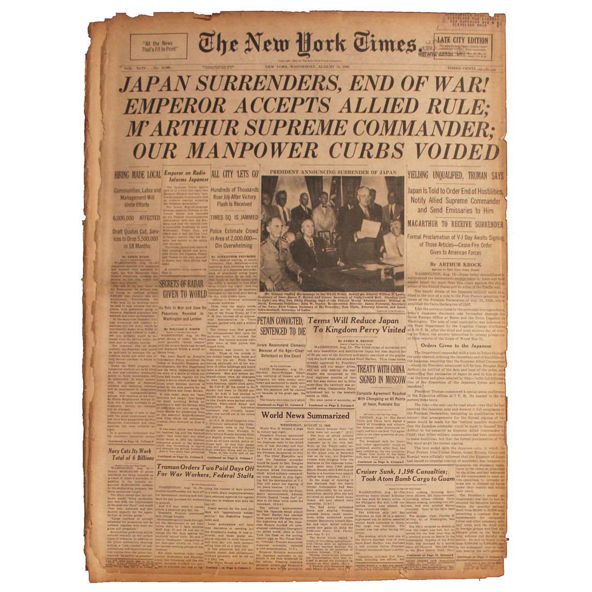 15 August 1945 edition of ''The New York Times,'' documenting V-J Day, with coverage of the Japanese signing the Instrument of Surrender. Article reads in part, ''…The bloody dream of the Japanese military caste vanished in the text of a note to the Four Powers accepting the terms of the Potsdam Declaration of July 26, 1945…'' Another article discusses the signing of a peace agreement between the Soviet Union and China. 36pp. paper measures 16.5'' x 22.5''. Chipping, toning and separation along fold. Very good condition.