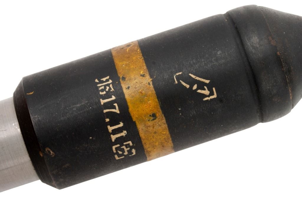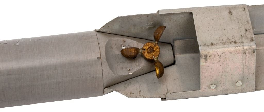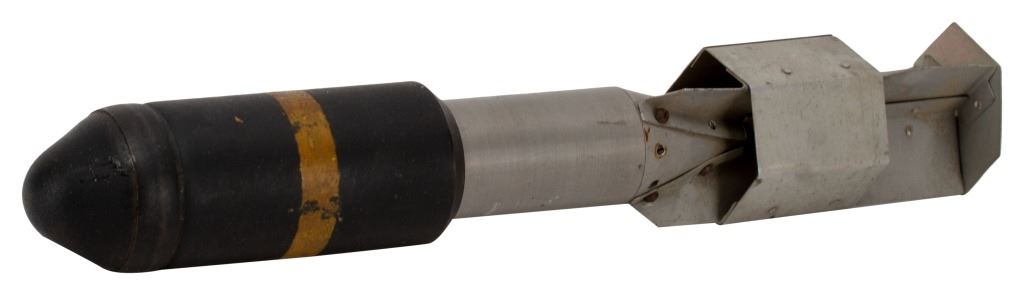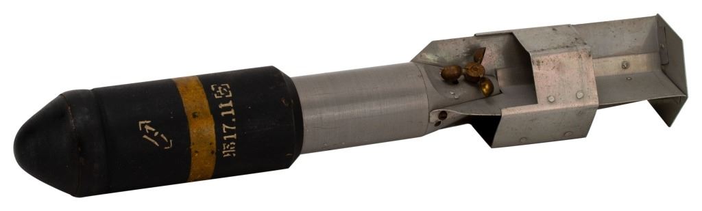 Item/Description: Late World War II Japanese Type II HEAT (High Explosive Anti-Tank) Cluster Bomb submunition. Metal fins and small brass propeller. Inert and can never be used as a weapon.